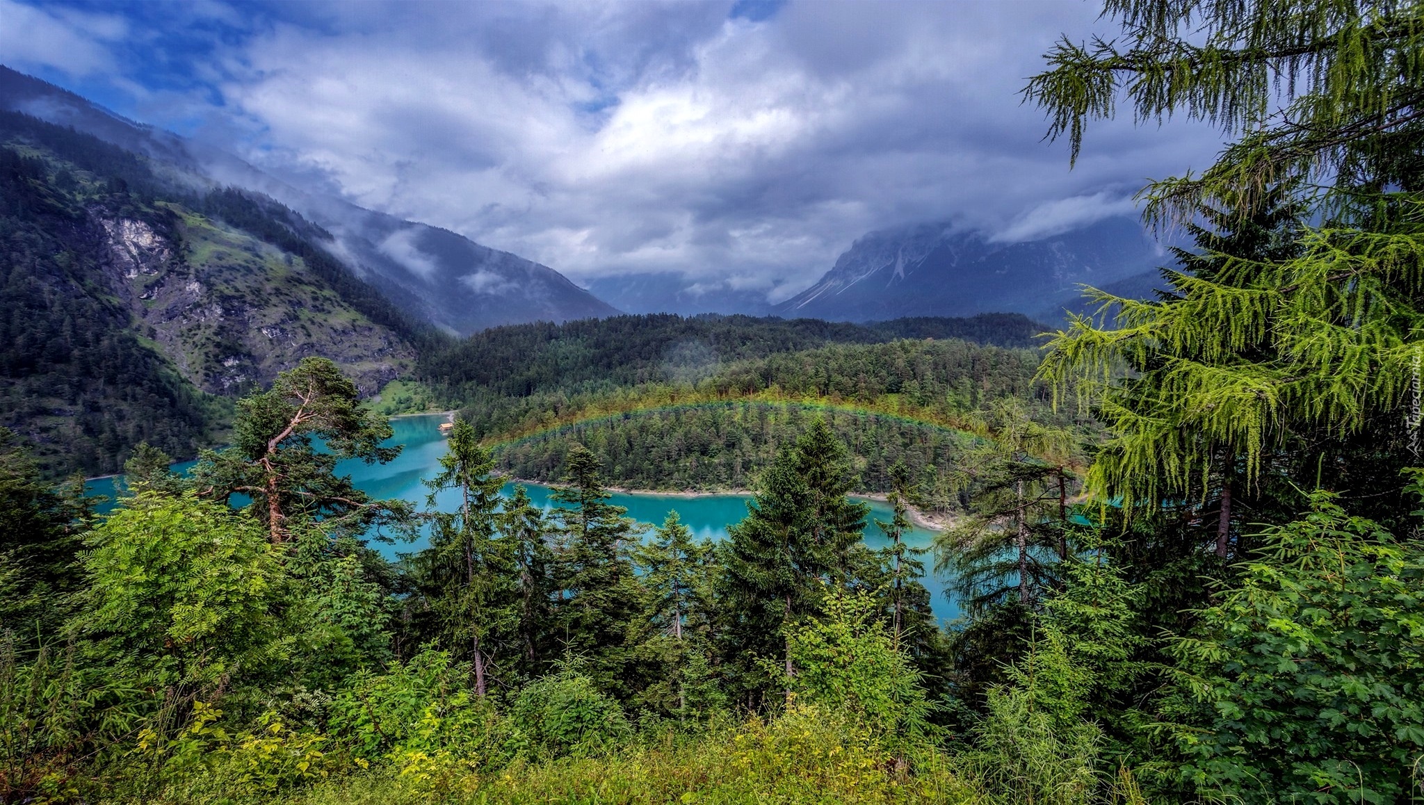 Edytor tapety: Widok na górskie jezioro wśród drzew