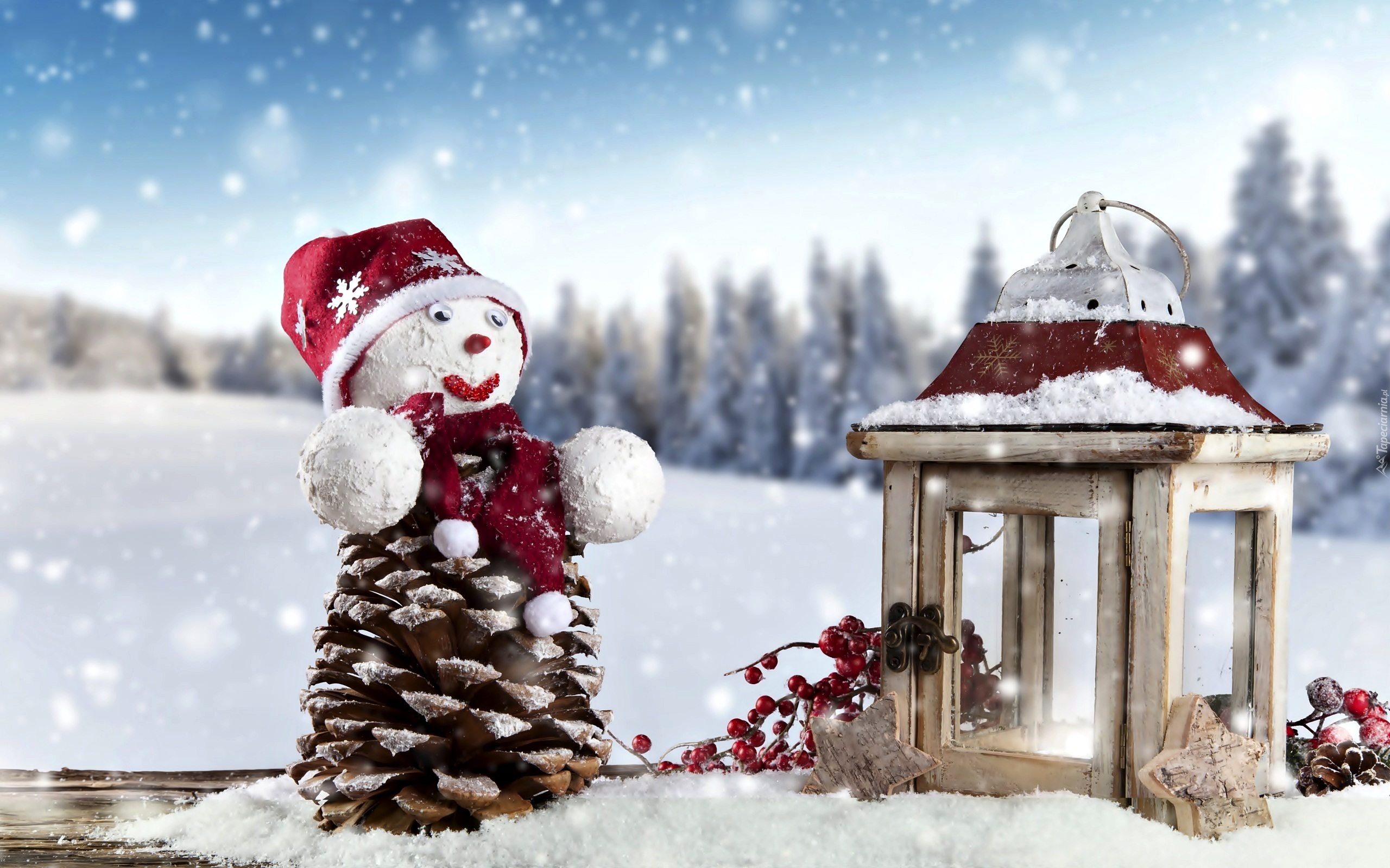 Edytor tapety: Szyszkowy bałwanek na śniegu i świąteczny lampion