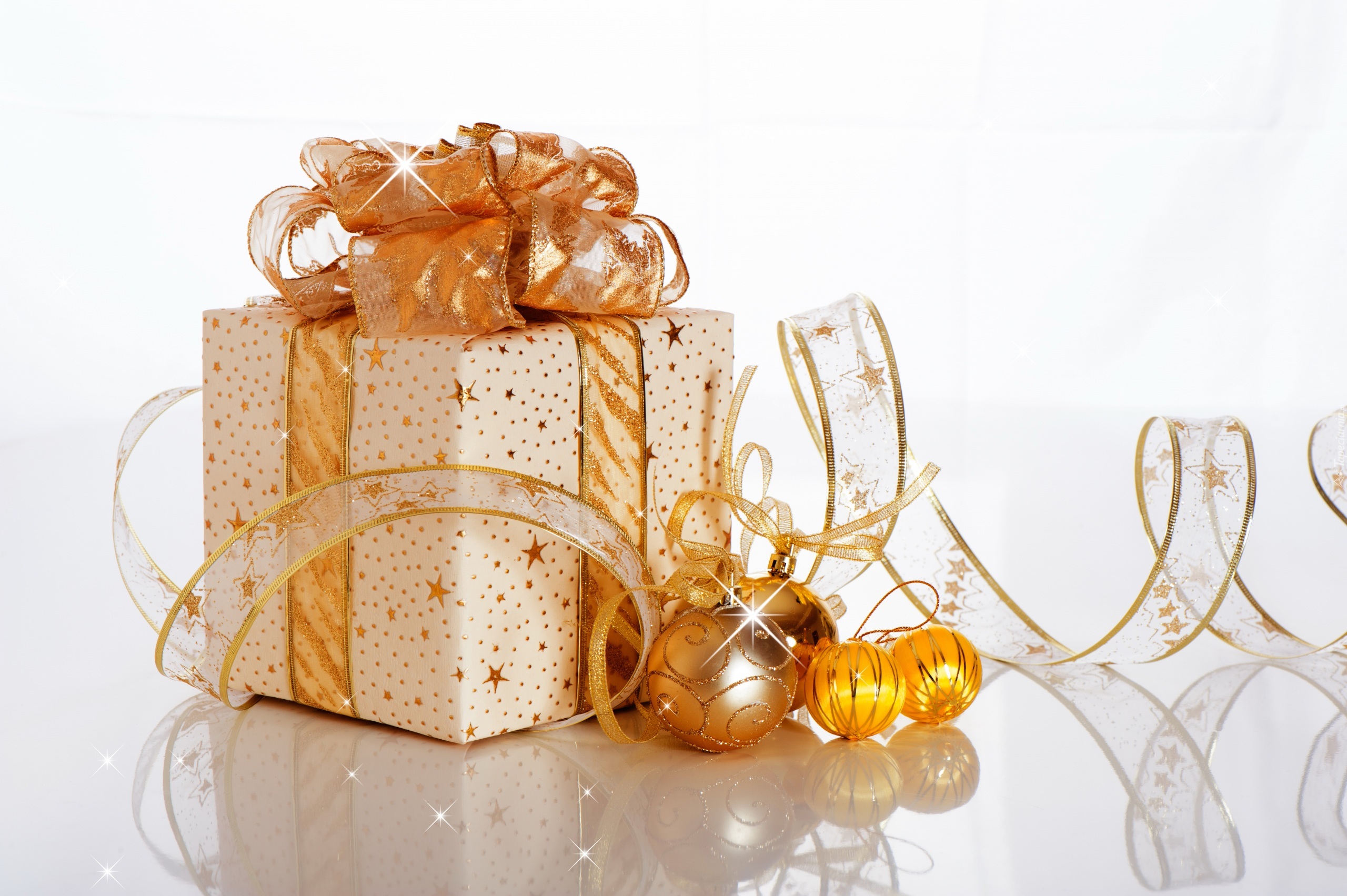 Edytor tapety: Świąteczny prezent ze wstążką i bombkami