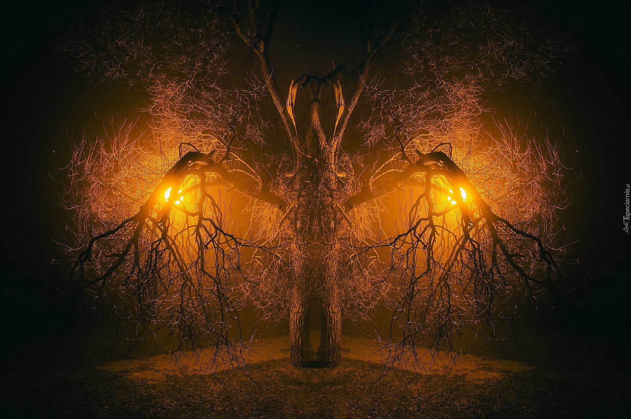 Edytor tapety: Oświetlone suche drzewo nocą
