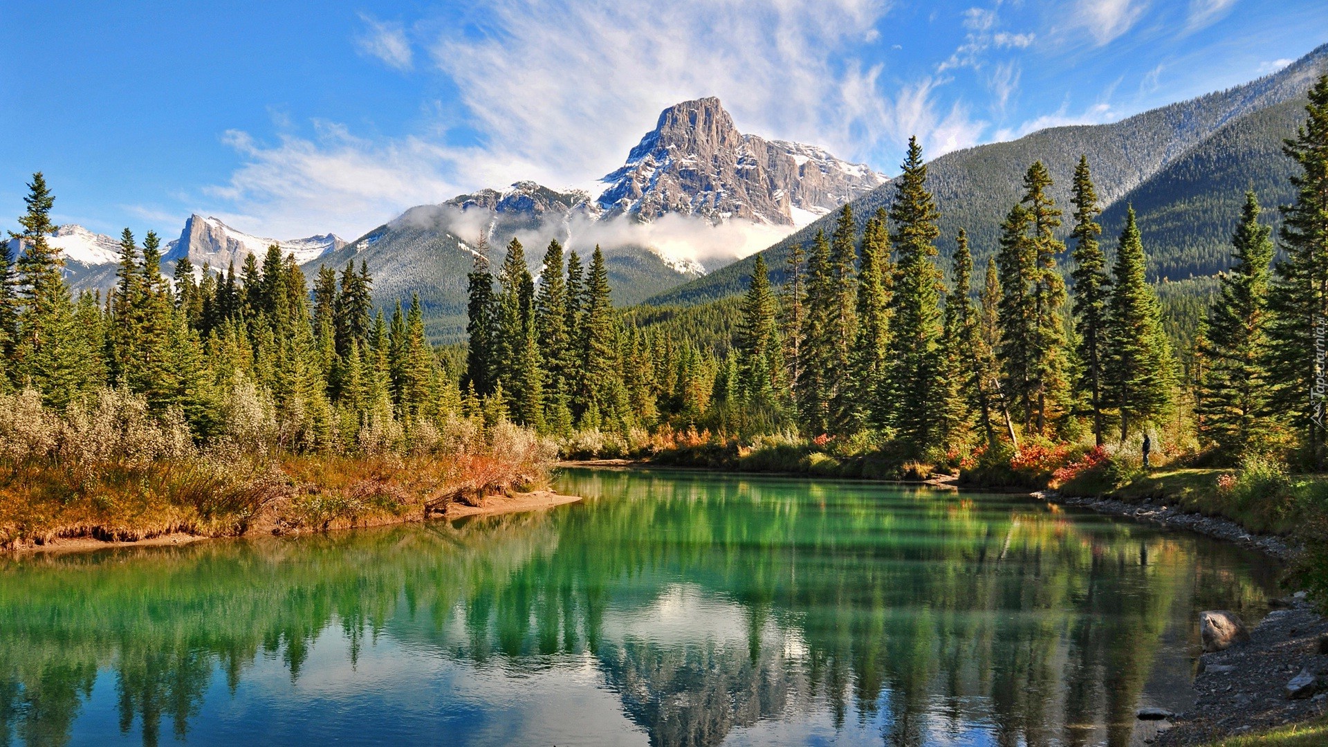 Edytor tapety: Ośnieżone szczyty gór z lasem i jeziorem