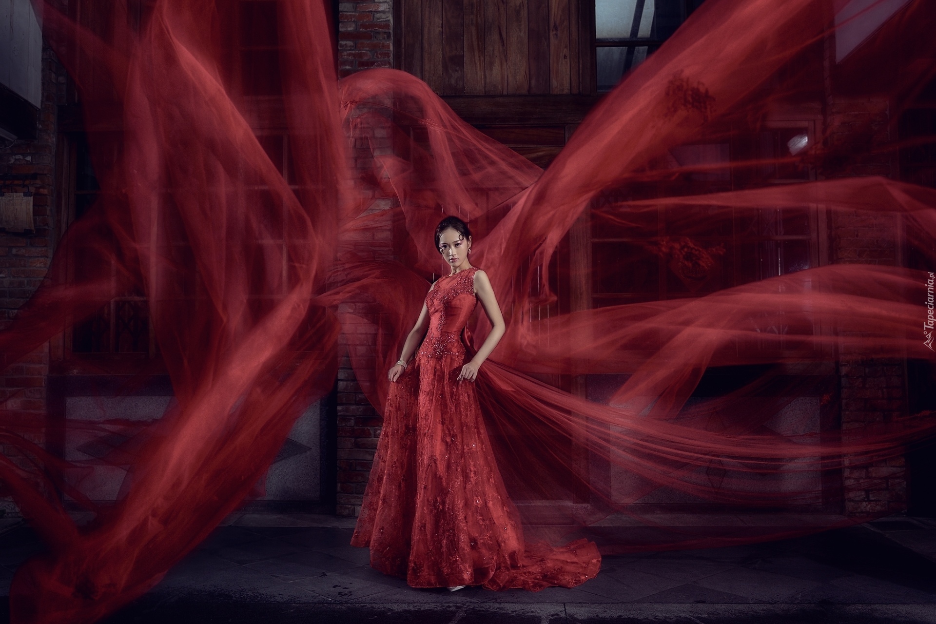 Edytor tapety: Piękna wysmukła Azjatka w długiej czerwonej sukni