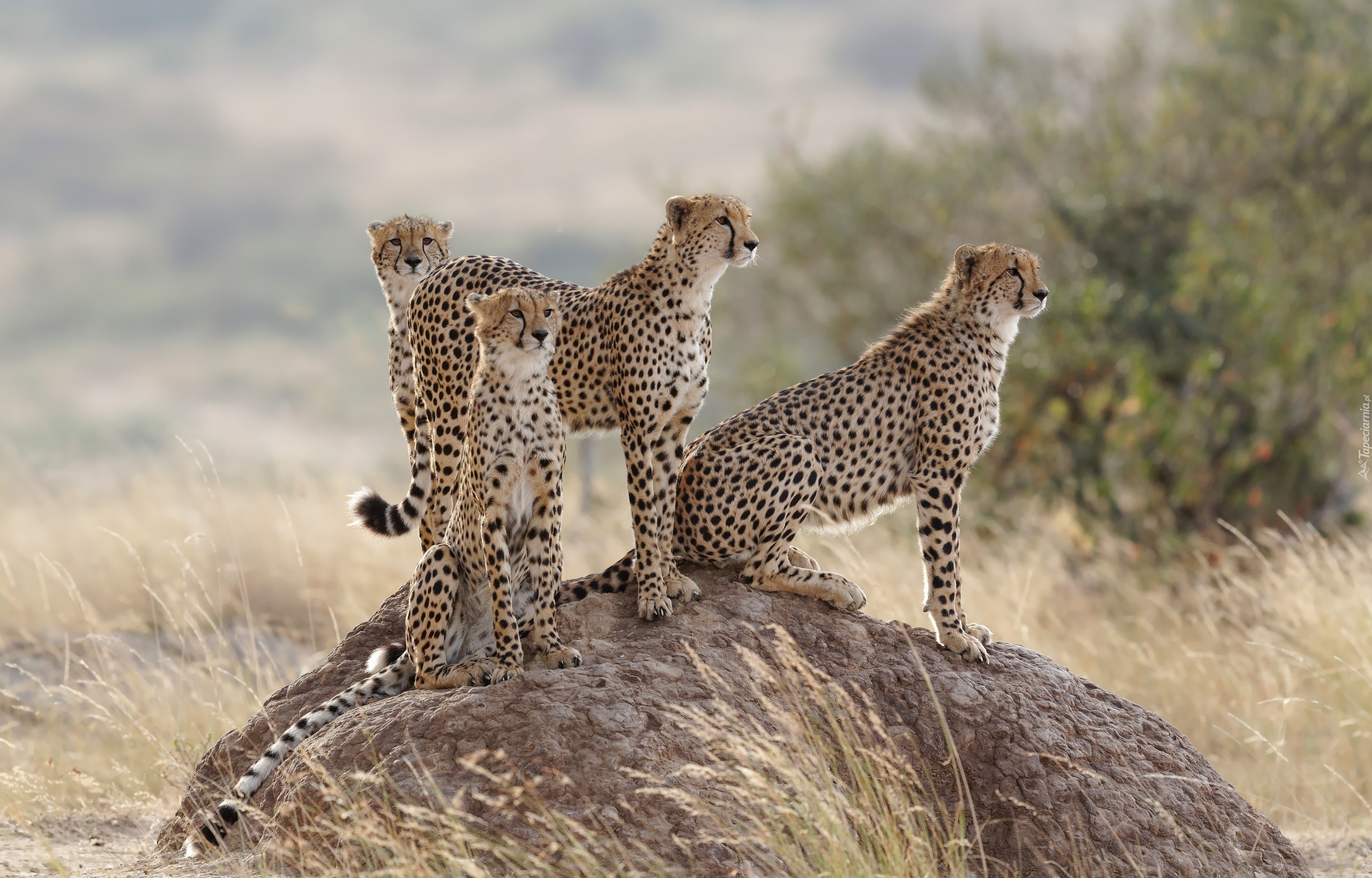 Edytor tapety: Cztery gepardy na kamieniu wśród traw