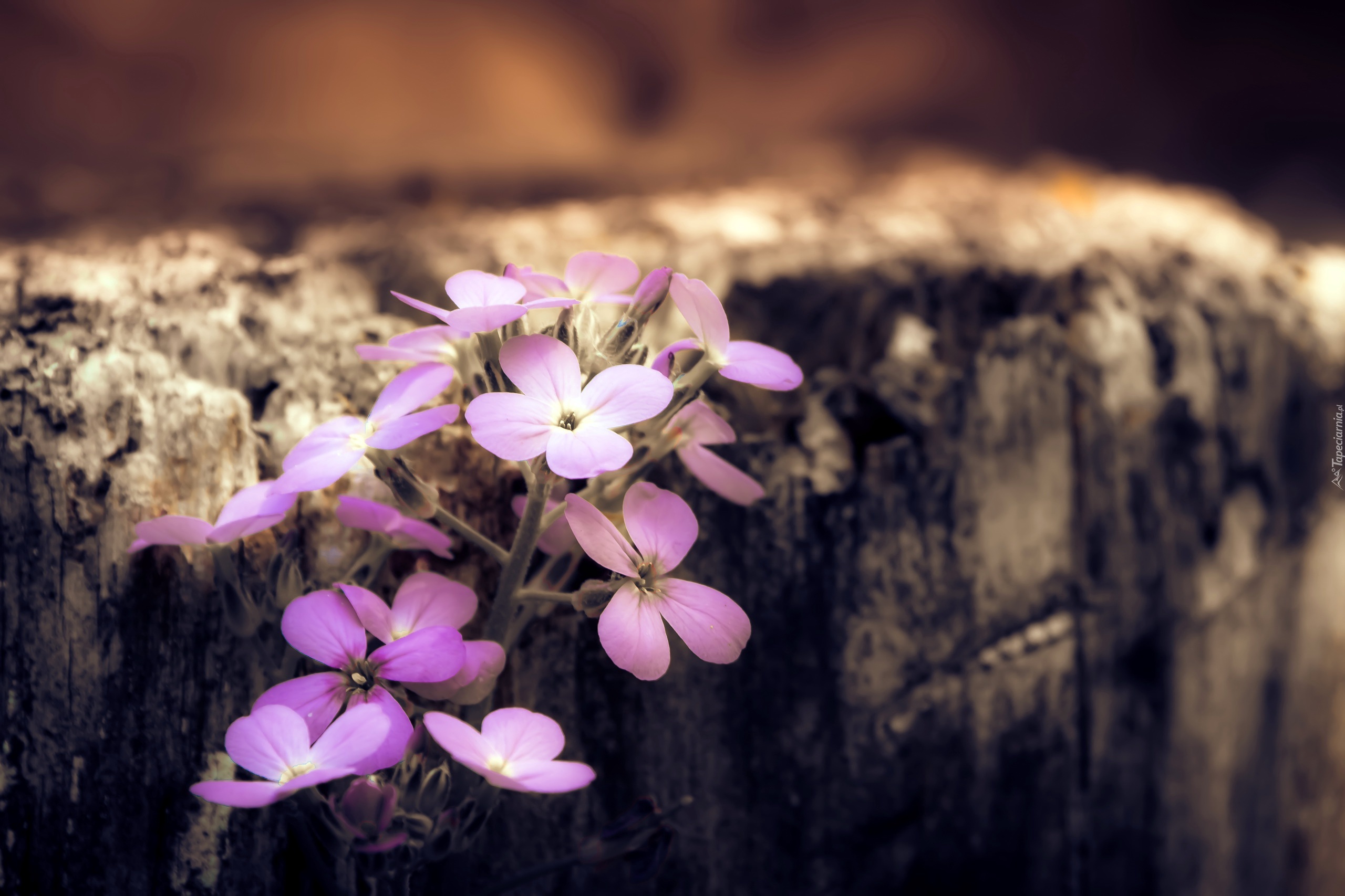 Edytor tapety: Drobne różowe kwiaty na rozmytym tle