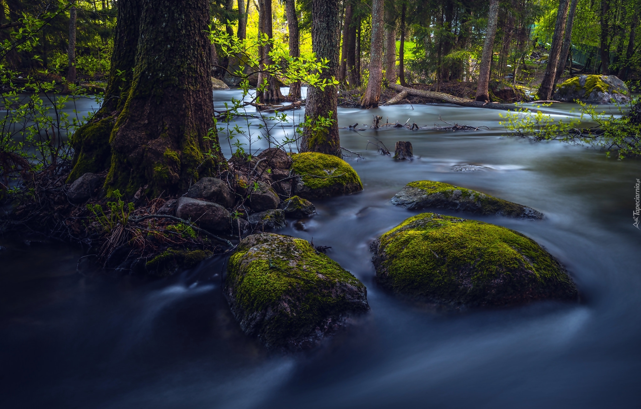 Edytor tapety: Leśny potok wśród drzew i omszałych kamieni