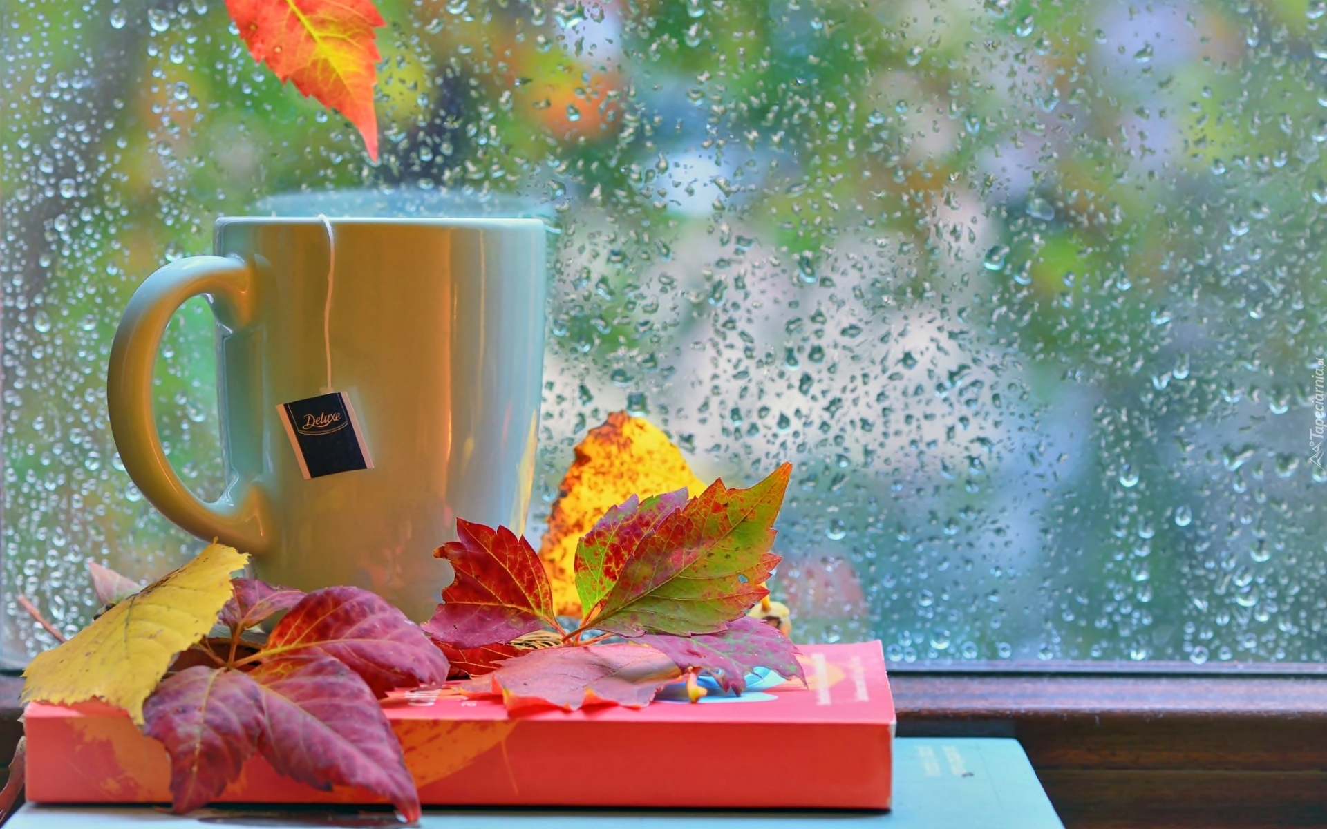 Edytor tapety: Filiżanka herbaty i książka na jesienne deszczowe dni
