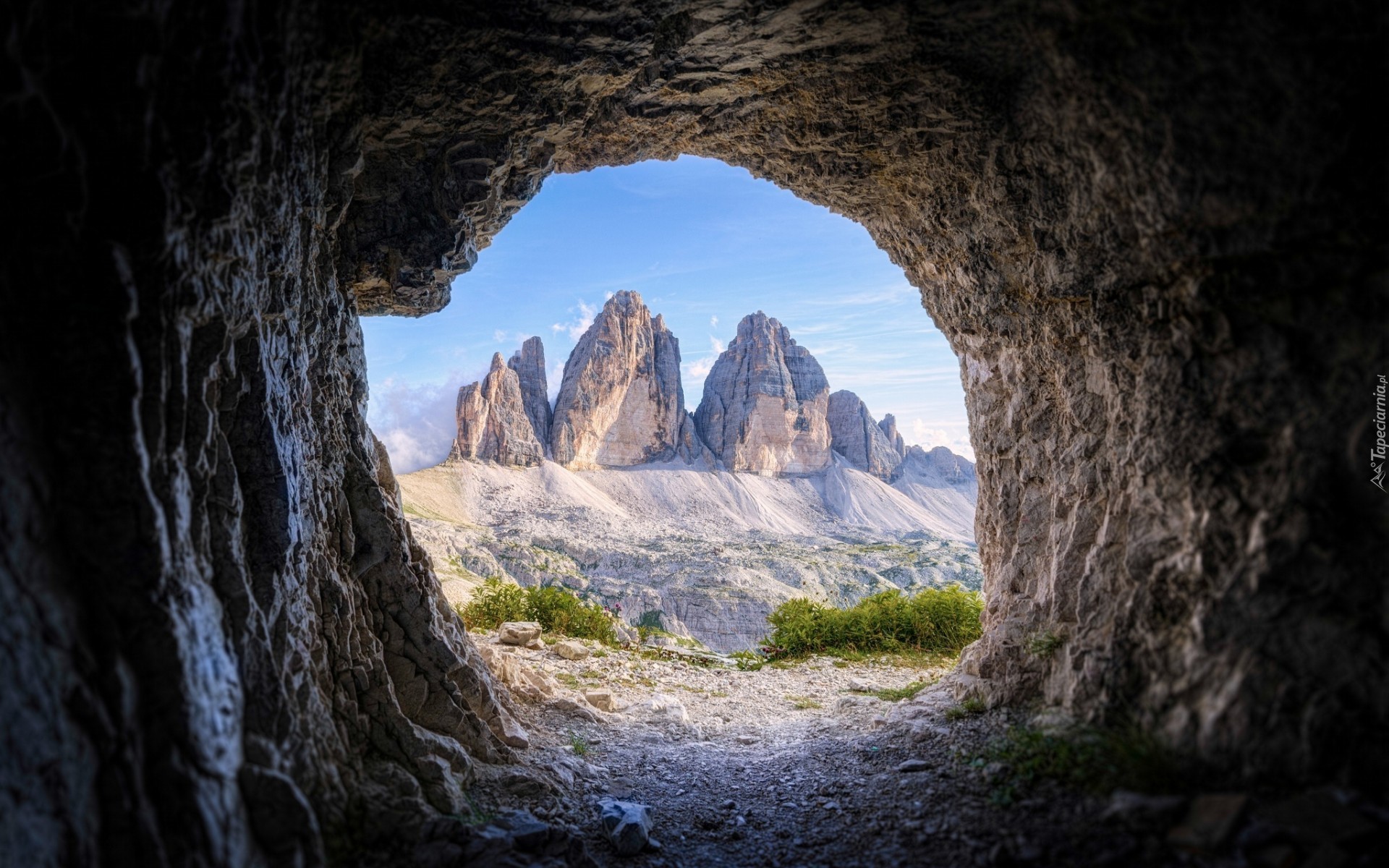 Edytor tapety: Widok z groty na skały i rośliny