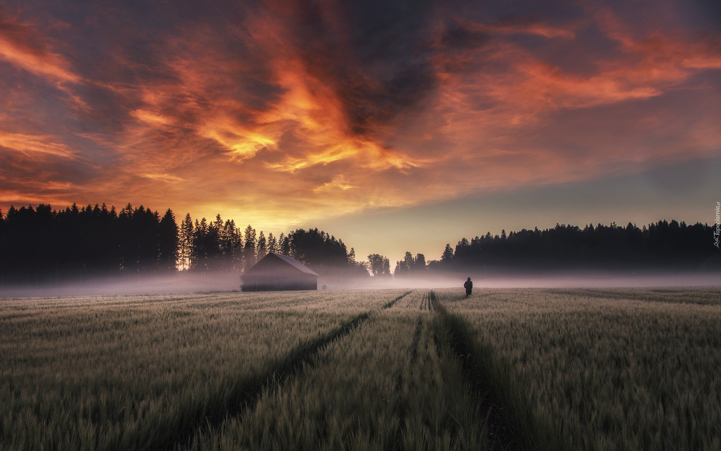 Edytor tapety: Dom na polu we mgle o zachodzie słońca