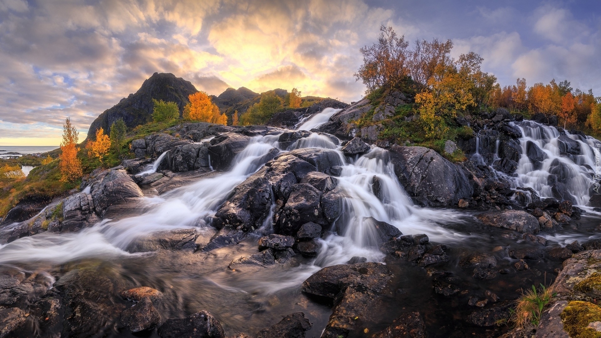 Edytor tapety: Wodospad na kamienistej skale i jesienne drzewa