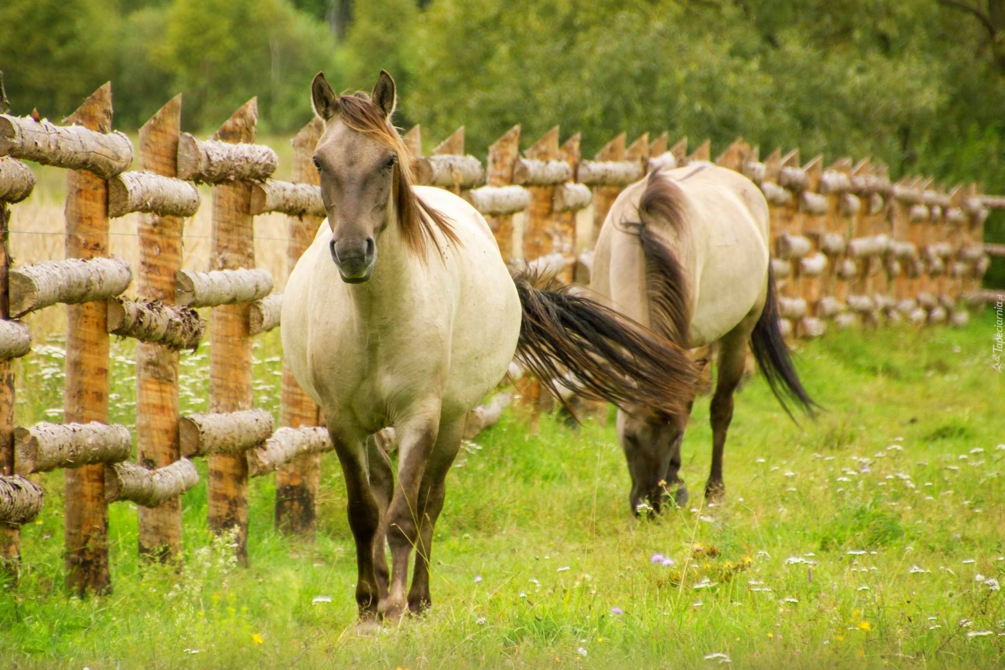 Edytor tapety: Konie na łące przy ogrodzeniu
