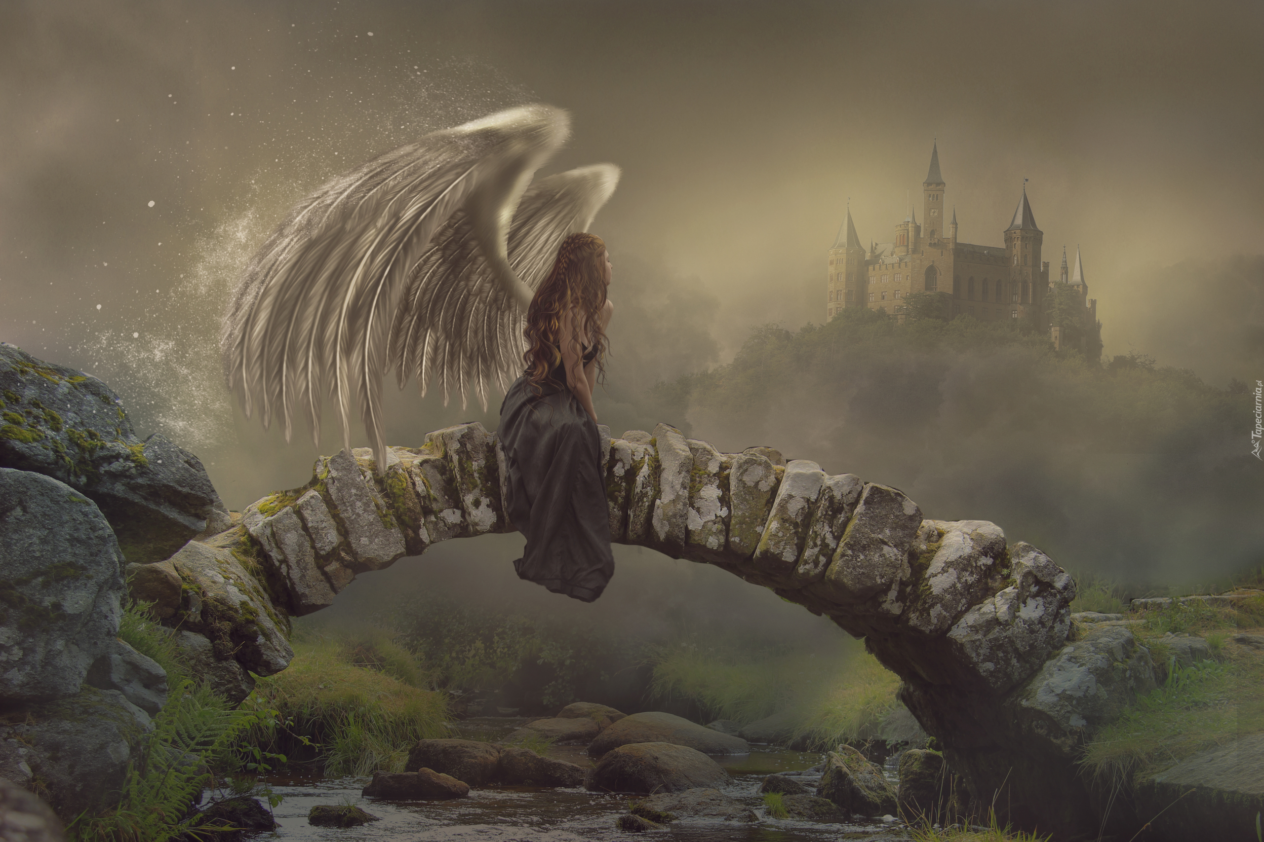 Edytor tapety: Kobieta-anioł spogląda na zamek
