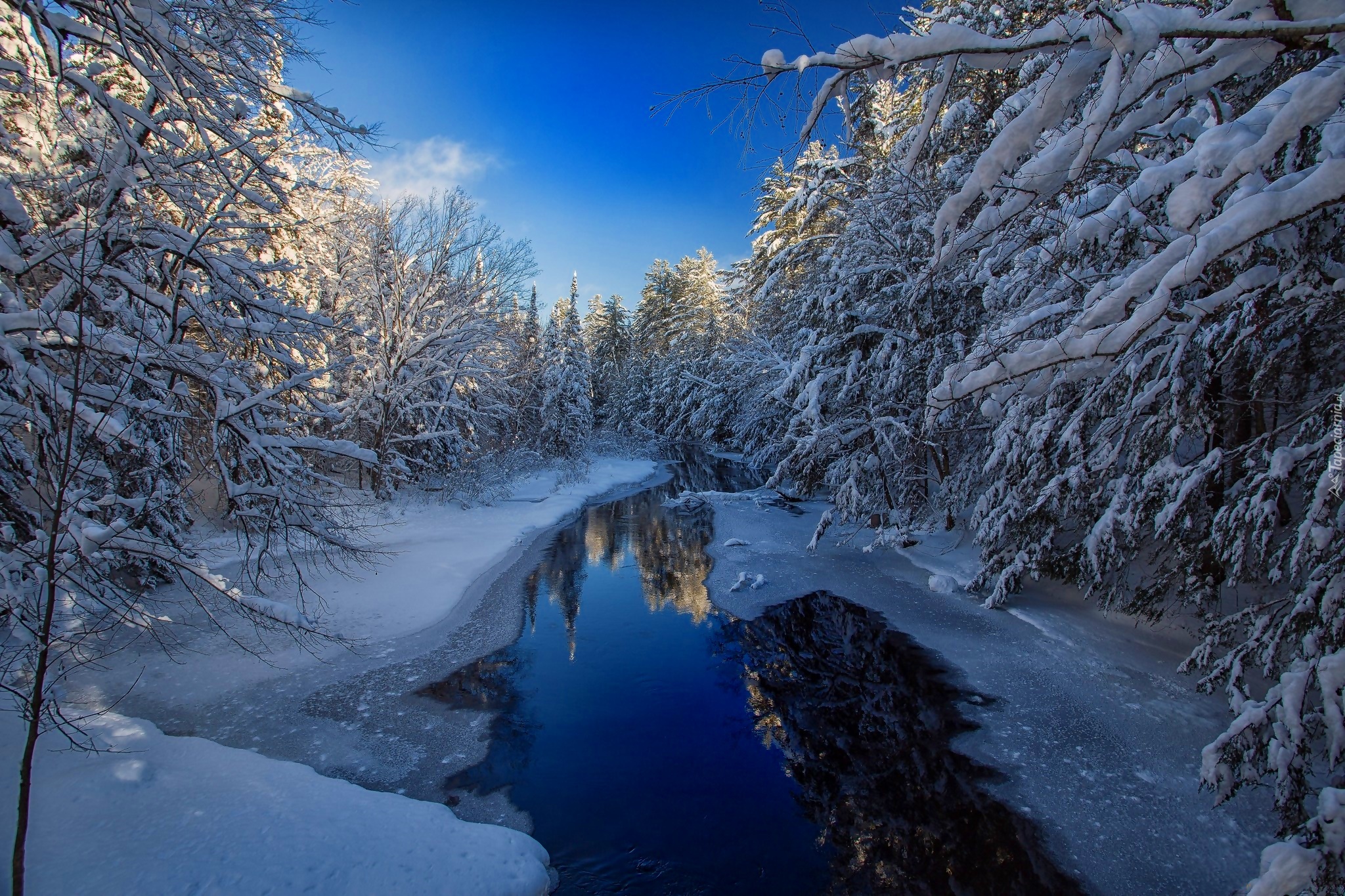 Edytor tapety: Rzeka przepływająca przez zimowy las