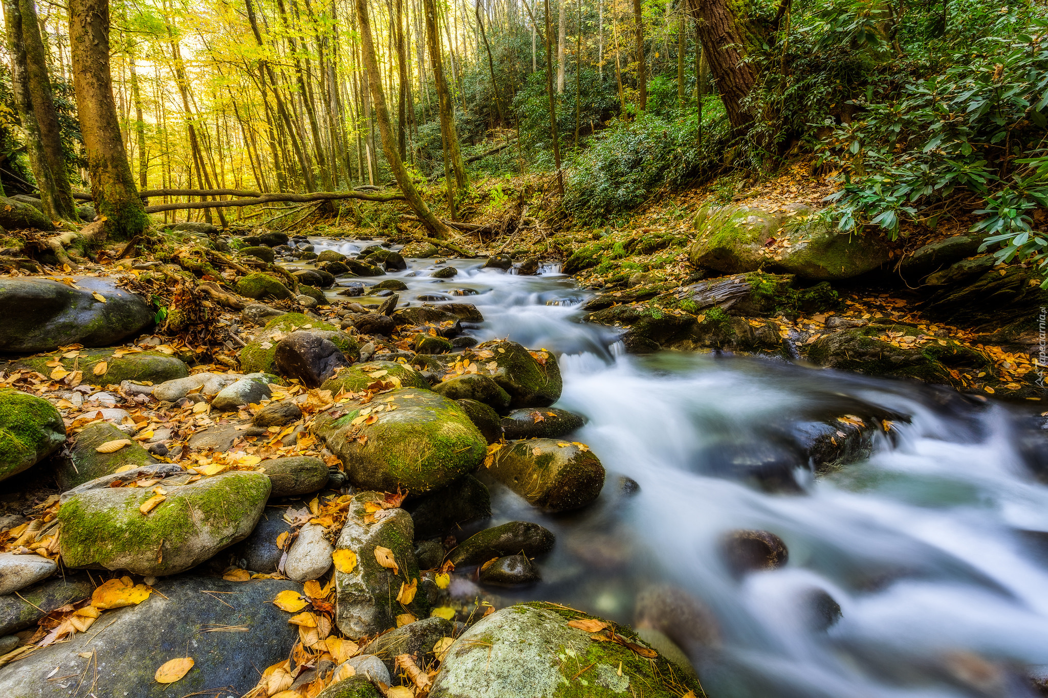Edytor tapety: Rwąca rzeka pośród kamieni w jesiennym lesie