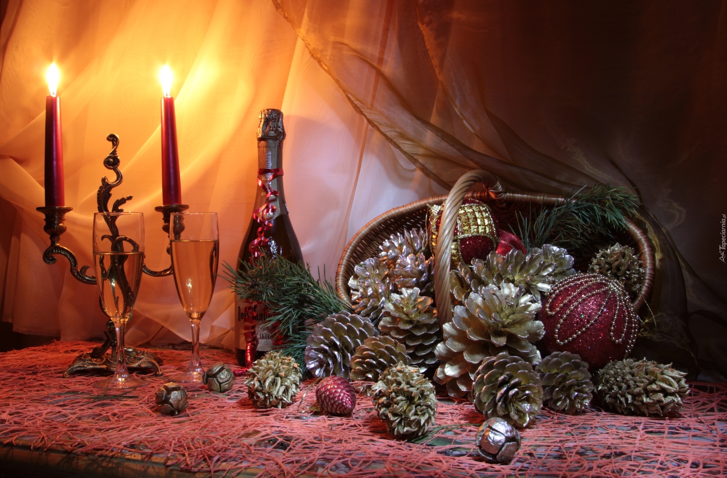 Edytor tapety: Świąteczna kompozycja z szampanem i świeczkami