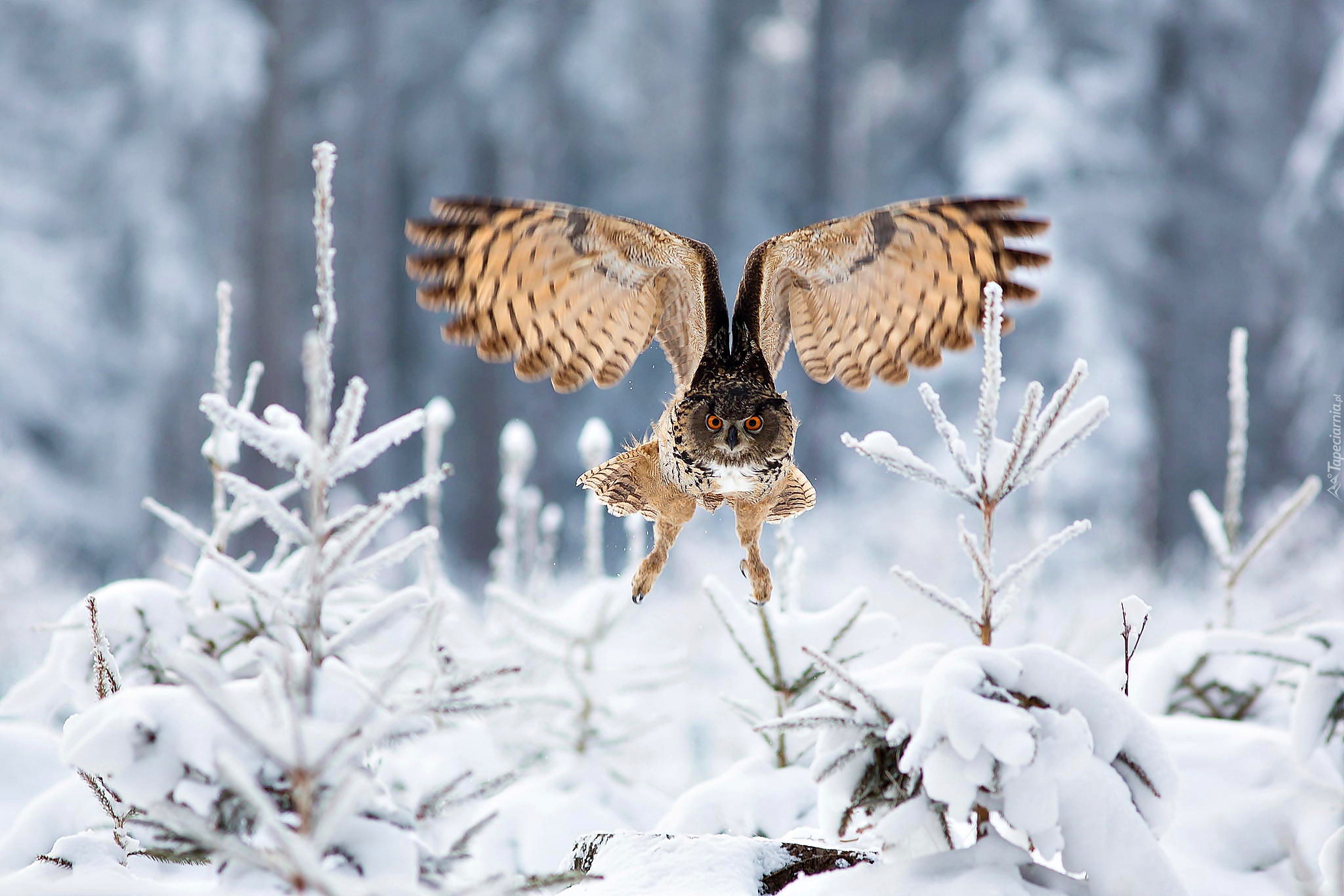 Edytor tapety: Lot sowy nad ośnieżonymi drzewami