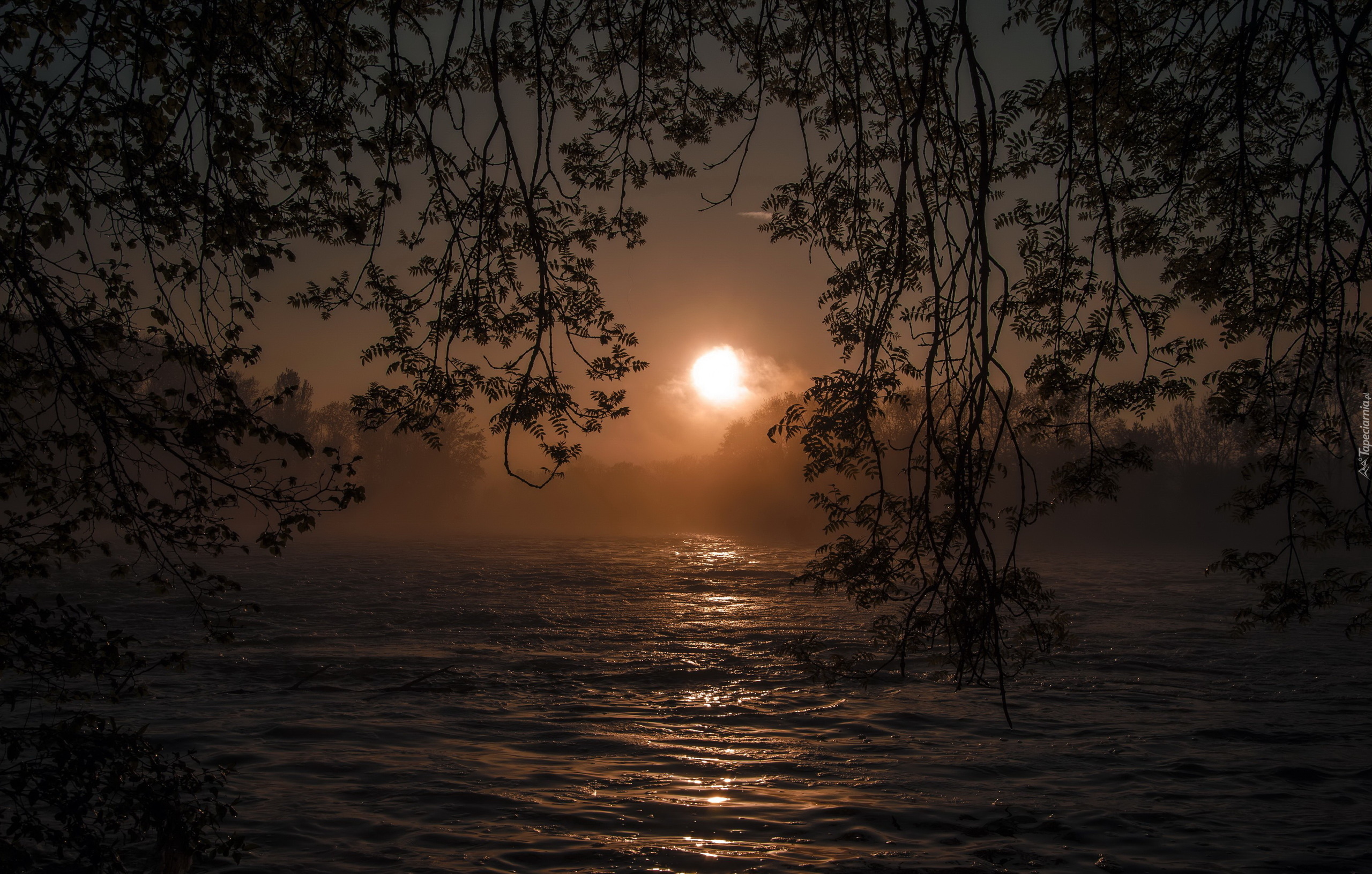 Edytor tapety: Mglisty zachód słońca nad rzeką