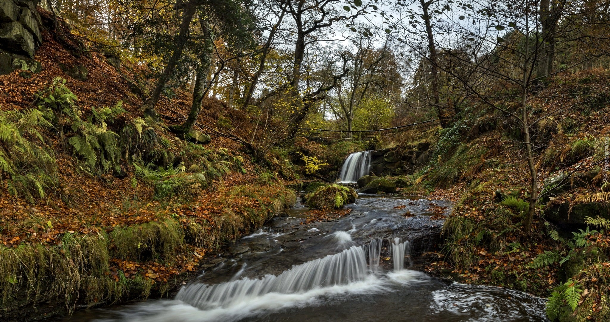 Edytor tapety: Mostek nad wodospadem w jesiennym lesie