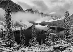 Edytor tapety: Błękitne jezioro otoczone ośnieżonymi drzewami w zamglonych górach