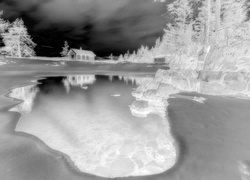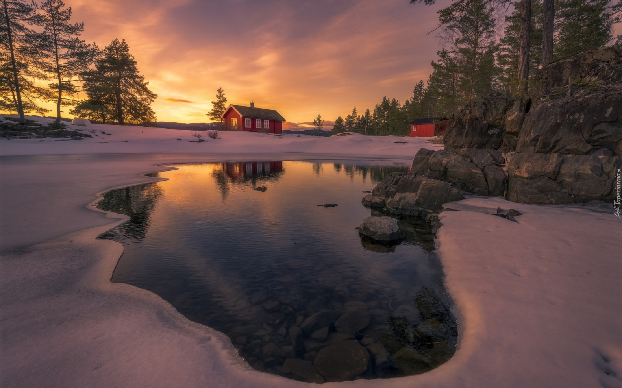 Edytor tapety: Drzewa i domy wokół zamarzniętego jeziora