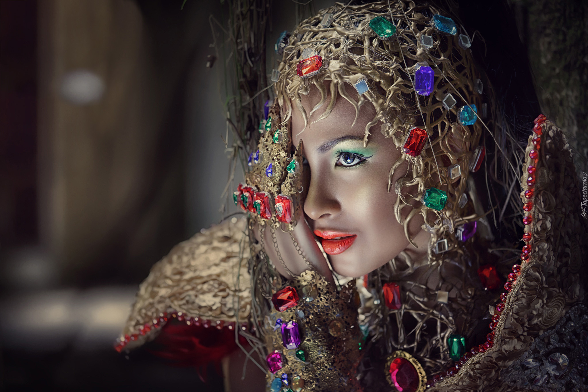 Edytor tapety: Kobieta z kolorowymi klejnotami we włosach