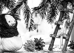 Edytor tapety: Włóczkowy bałwanek obok drabiny i szyszek