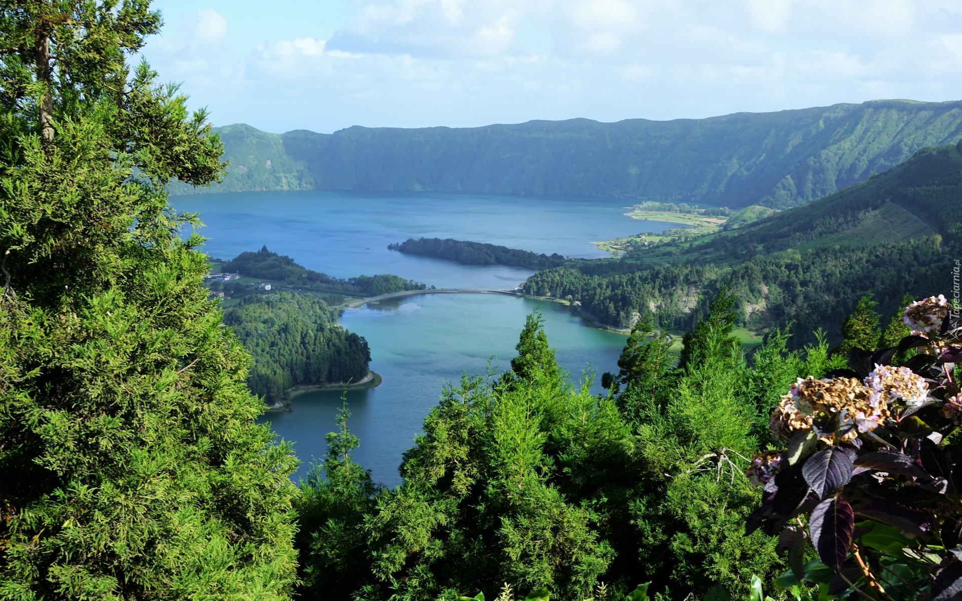 Edytor tapety: Jezioro otoczone lasem i górami