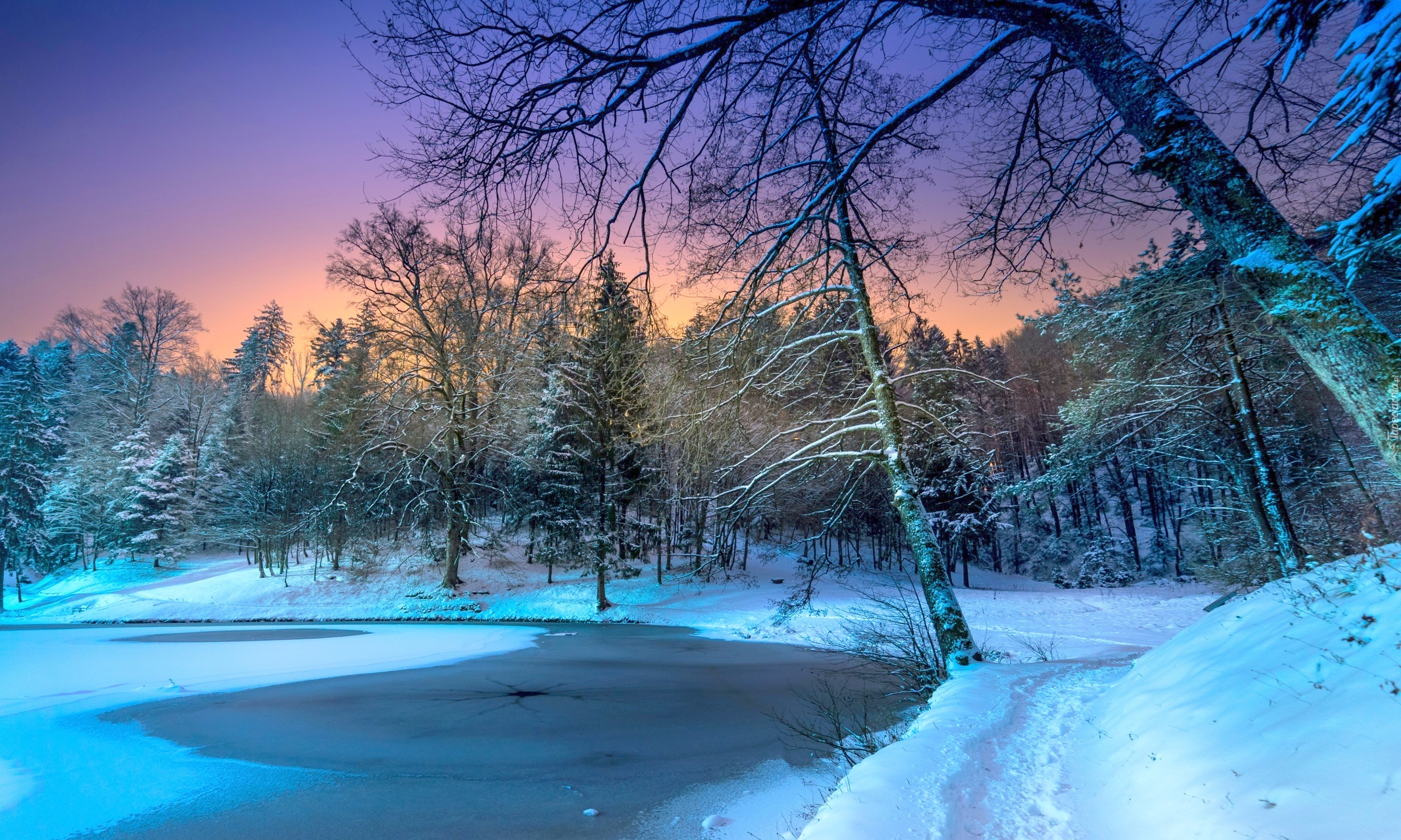 Edytor tapety: Staw i ścieżka prowadząca do zimowego lasu