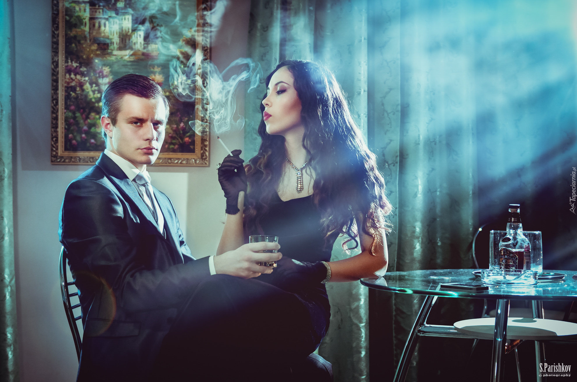 Edytor tapety: Kobieta paląca papierosa i mężczyzna z drinkiem