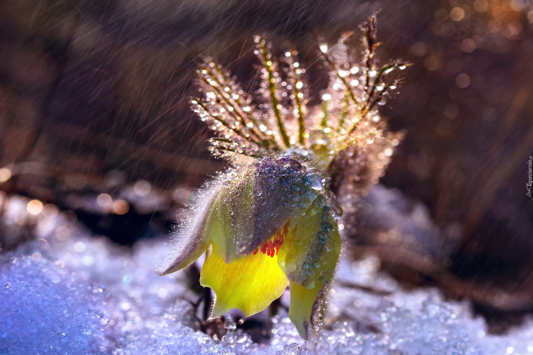 Edytor tapety: Oświetlona sasanka w kroplach deszczu