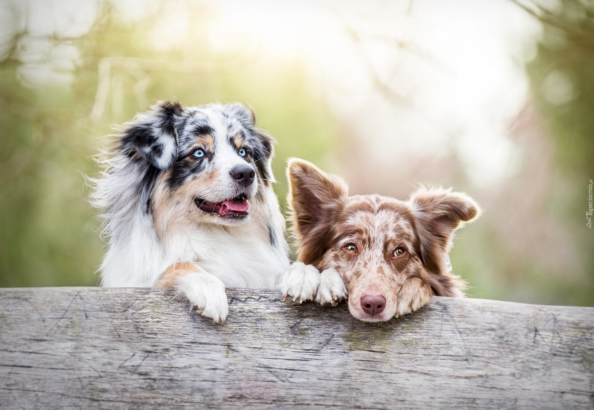 Edytor tapety: Owczarki australijskie wychylają się zza kłody