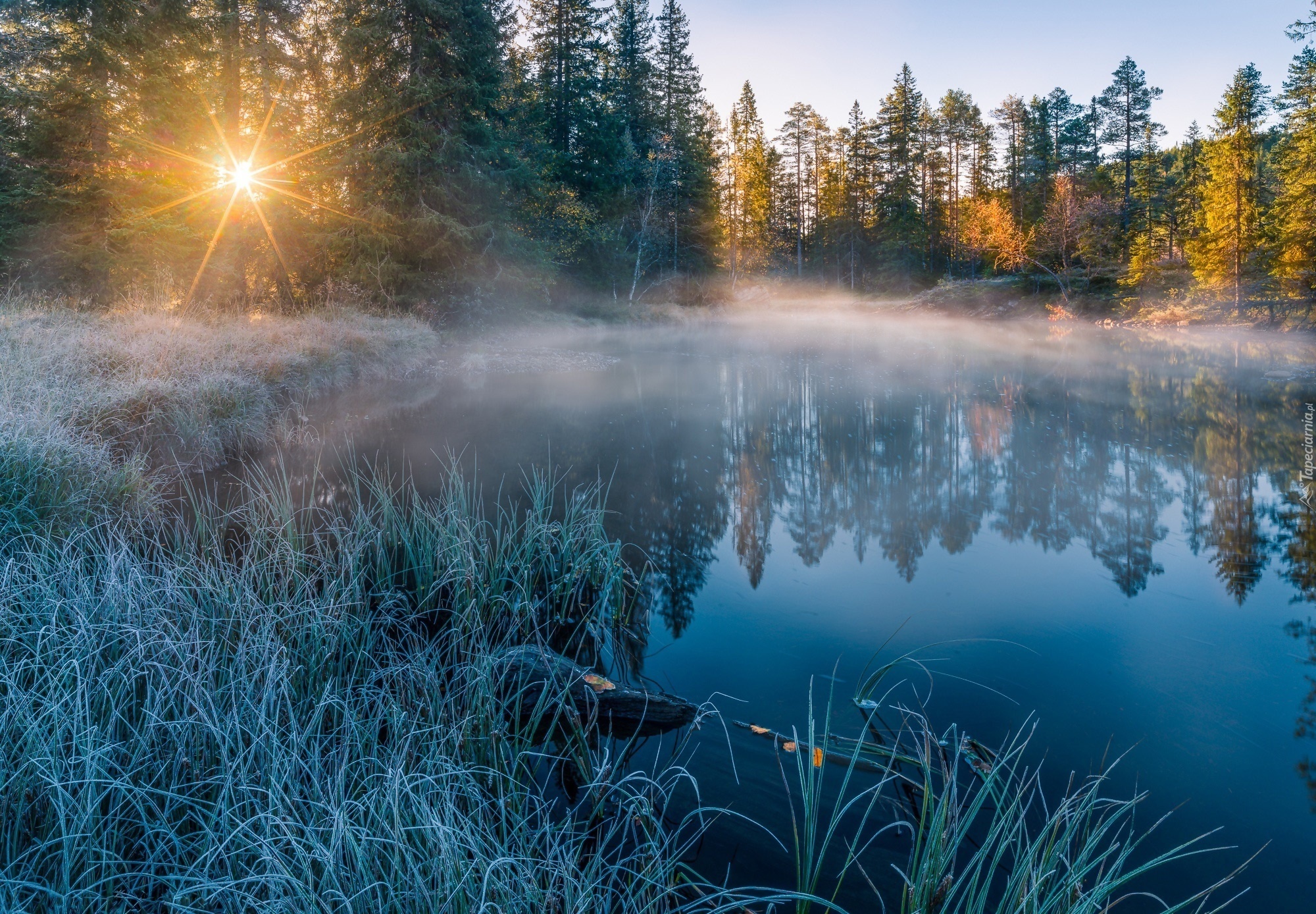 Edytor tapety: Promienie słoneczne rozpraszają mgłę nad zimową rzeką