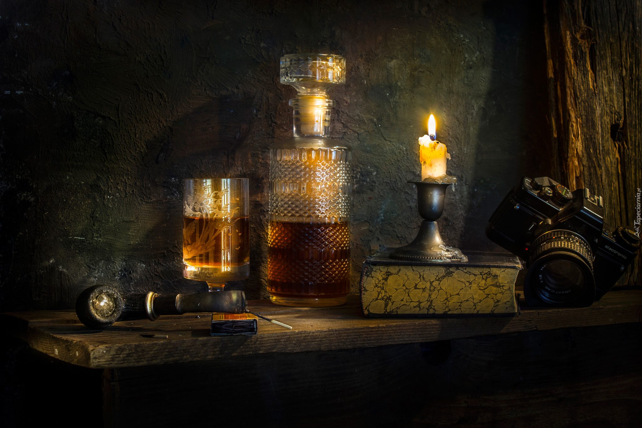 Edytor tapety: Kompozycja z karafką i aparatem w blasku świecy