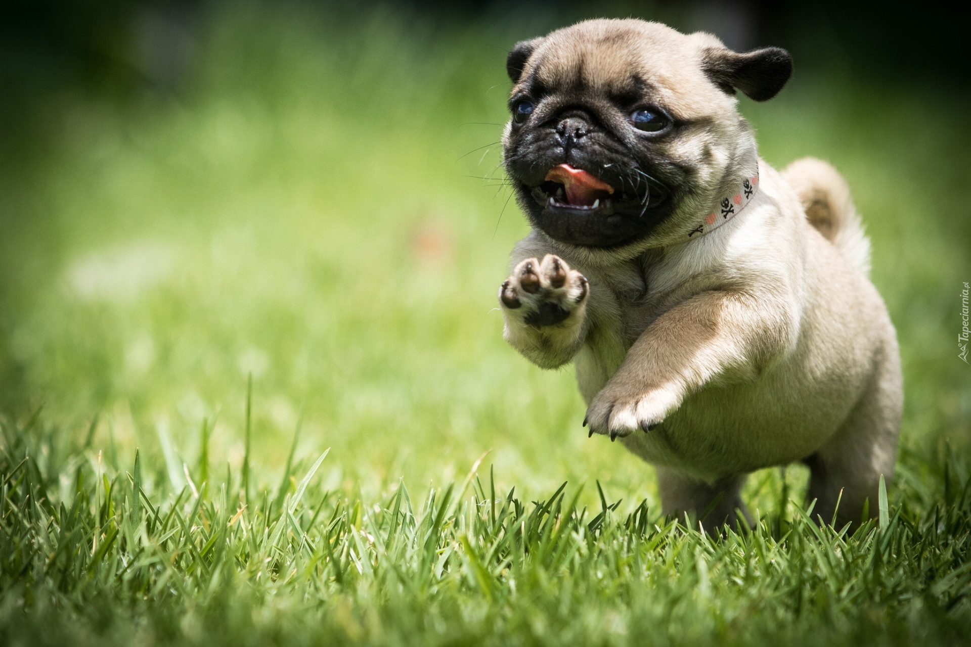Edytor tapety: Mops hasa w trawie