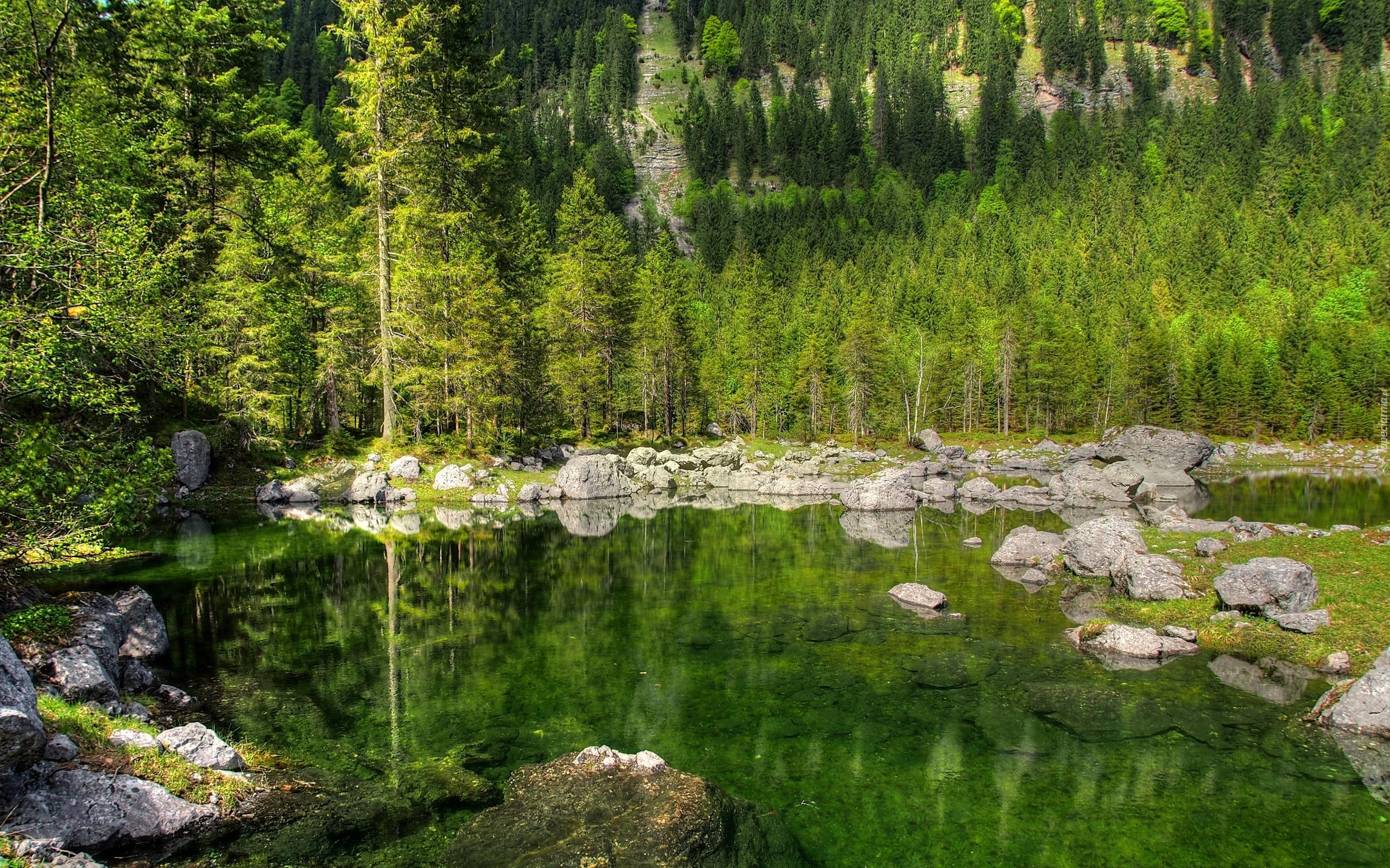 Edytor tapety: Jezioro z kamienistym brzegiem otoczone drzewami