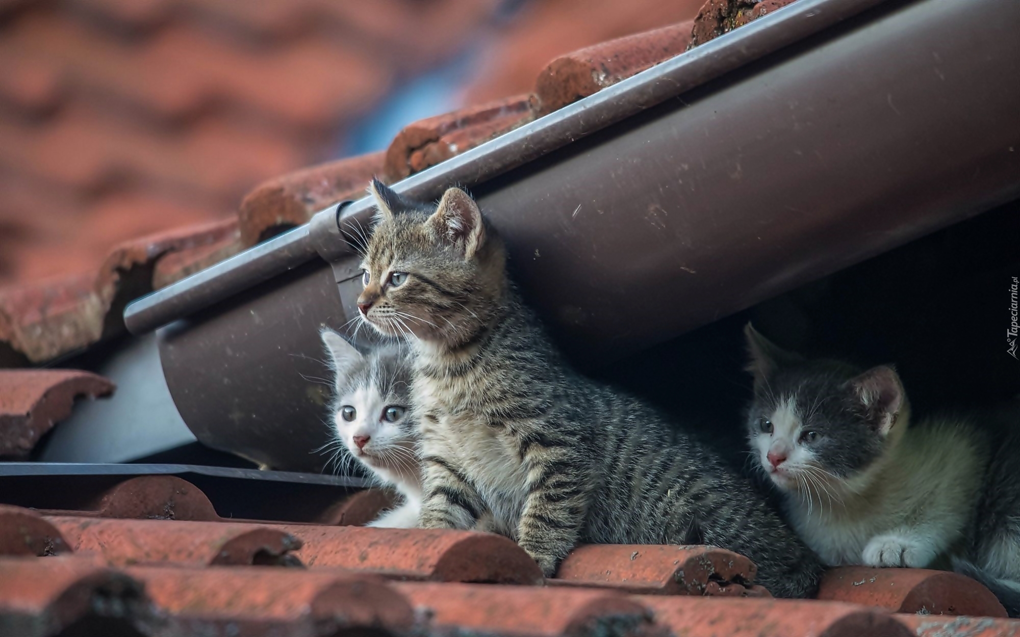 Edytor tapety: Trzy małe kotki obserwują świat z dachu