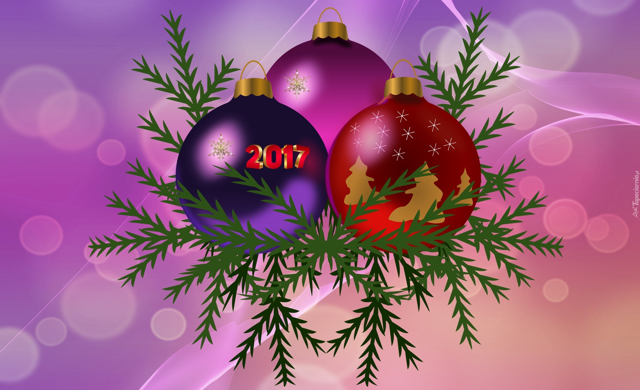 Edytor tapety: Kolorowe bombki w dekoracji z gałązkami świerku