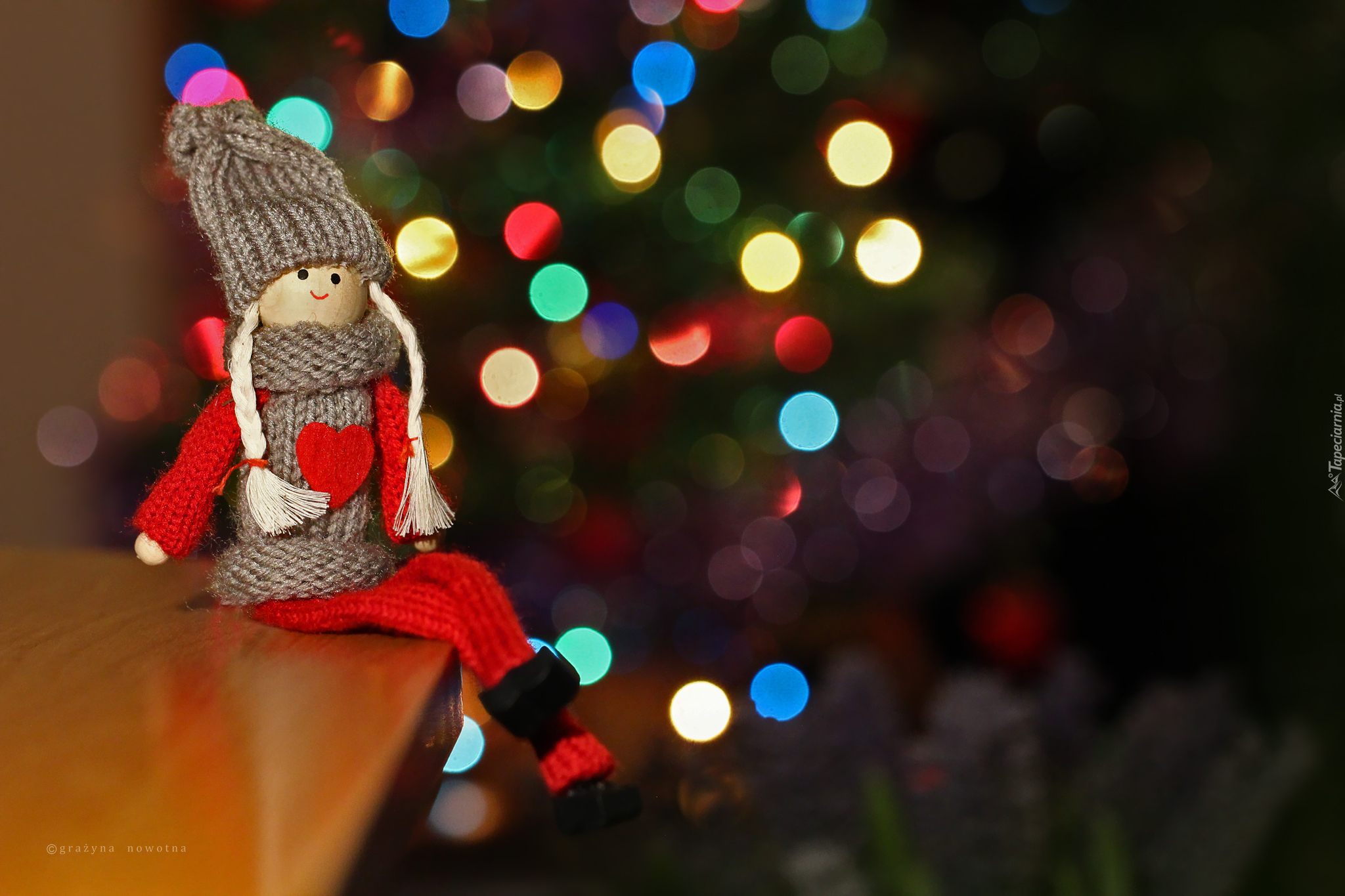 Edytor tapety: Laleczka w wełnianym ubranku na tle światełek