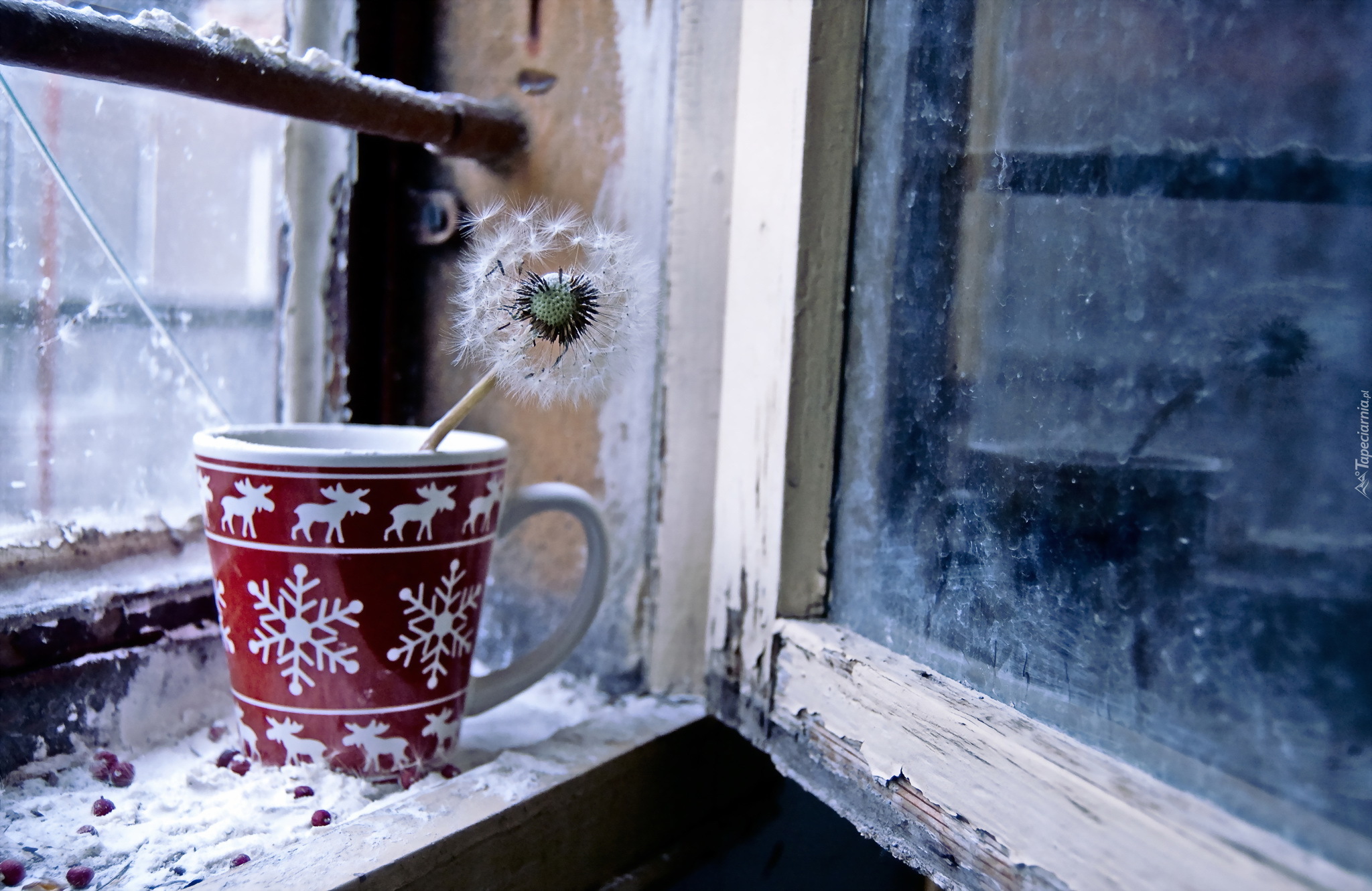 Edytor tapety: Mniszek w kubku ozdabia stare okno