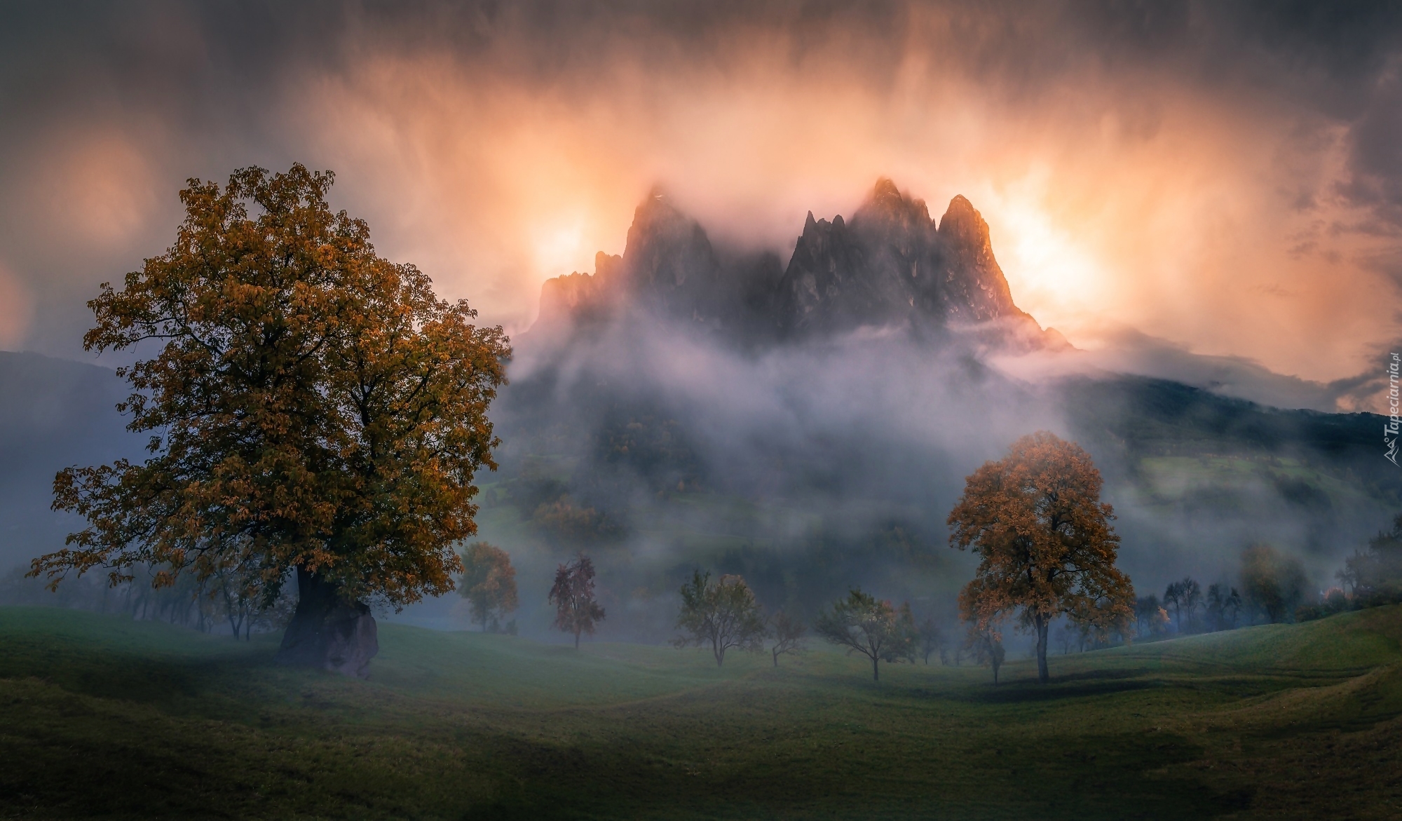 Edytor tapety: Góry i drzewa spowite mgłą