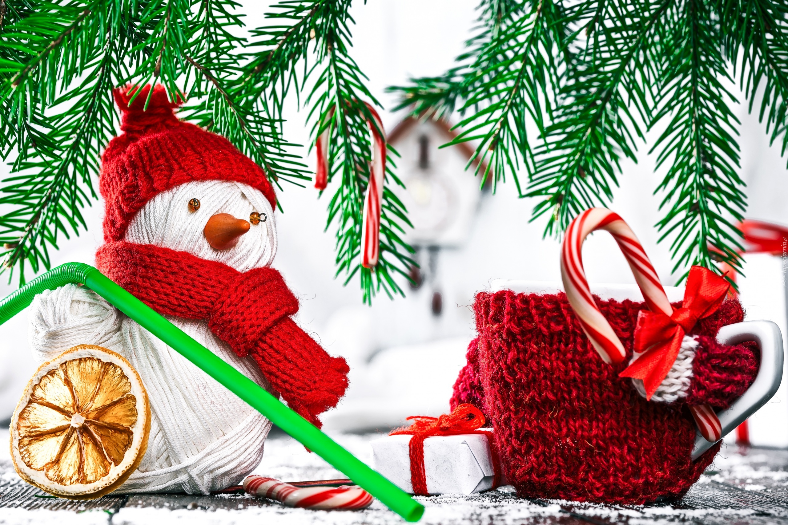 Edytor tapety: Włóczkowy bałwanek pod gałązkami świerkowymi