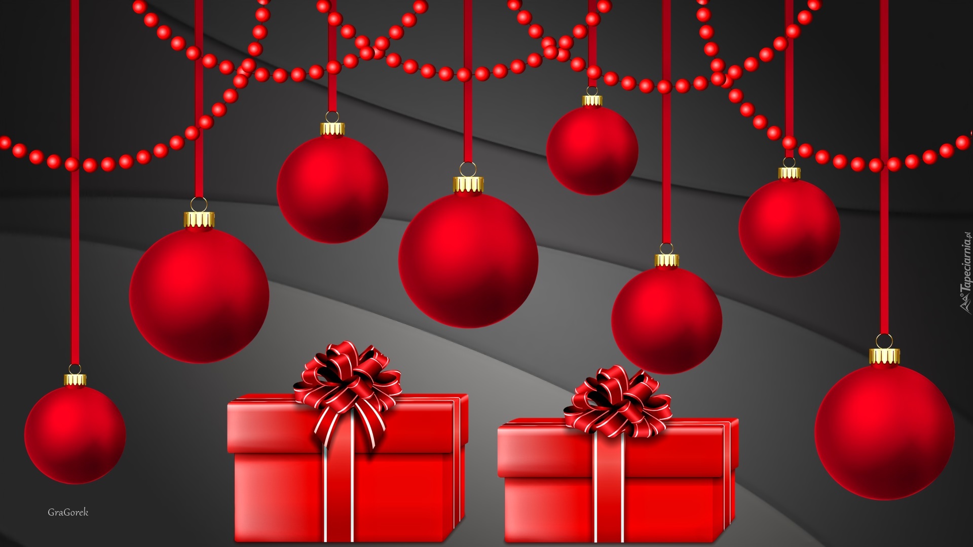 Edytor tapety: Czerwone bombki wiszą nad gwiazdkowymi prezentami