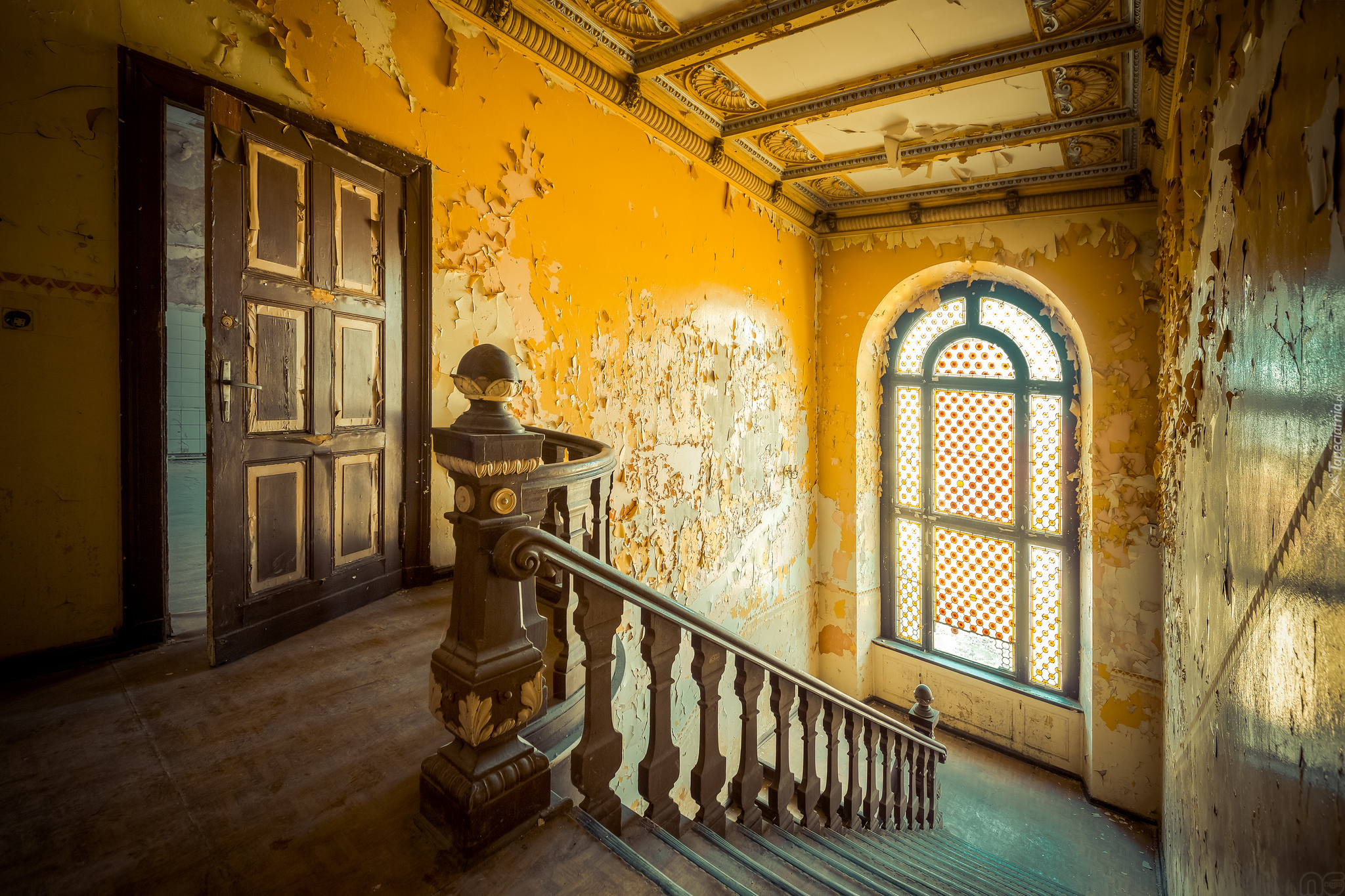 Edytor tapety: Korytarz i schody z balustradą w zniszczonym wnętrzu