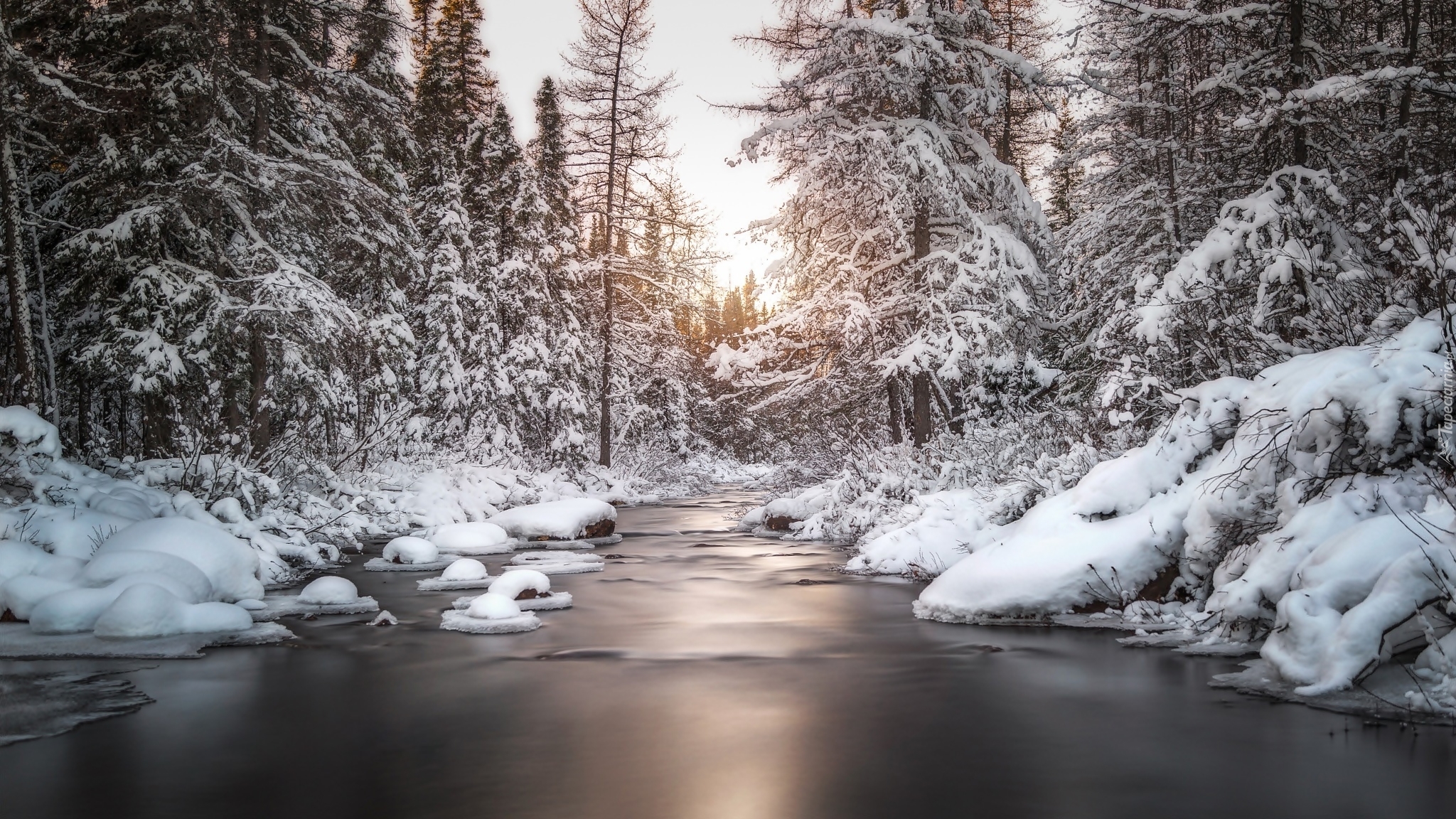 Edytor tapety: Rzeka płynie przez ośnieżony las