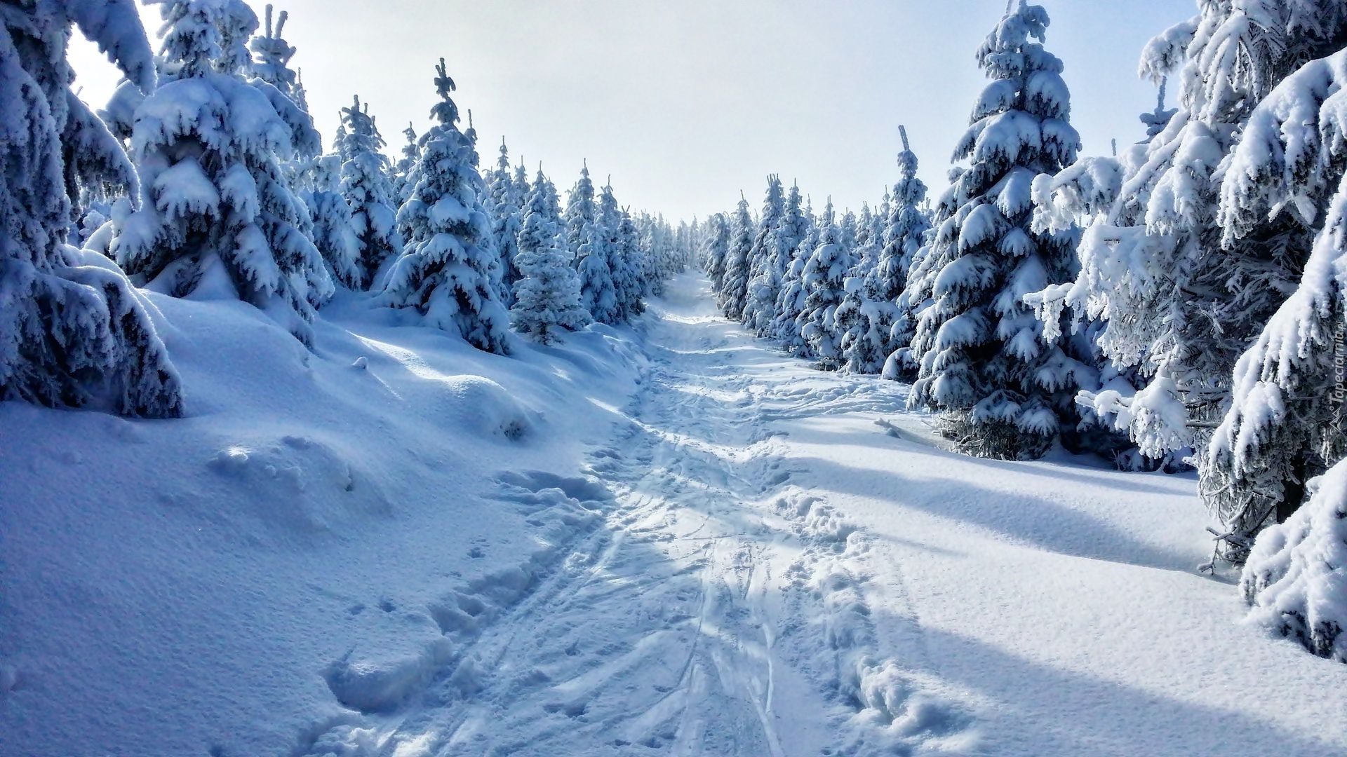 Edytor tapety: Leśna droga wśród ośnieżonych choinek