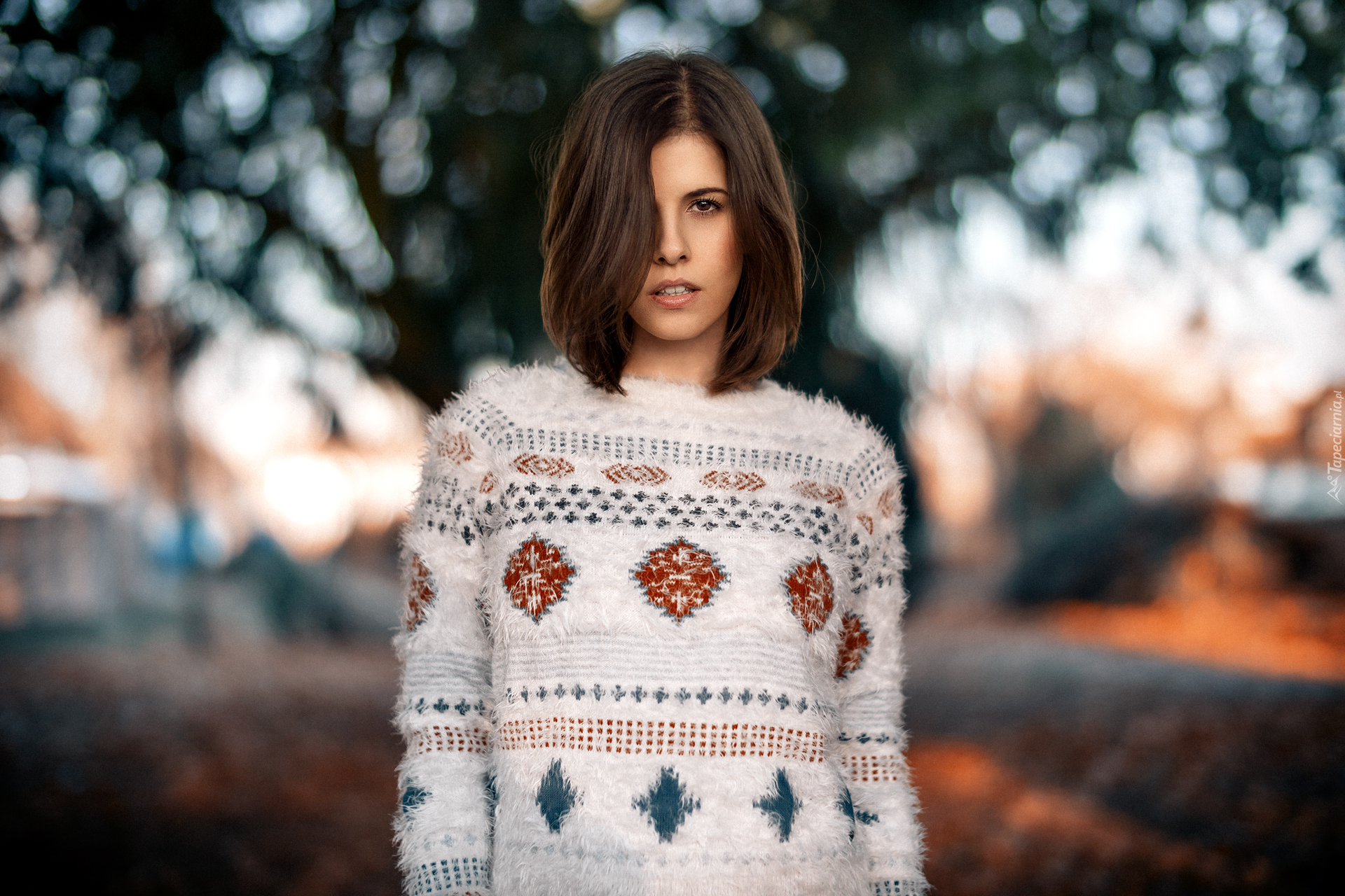 Edytor tapety: Piękna brunetka w kolorowym swetrze