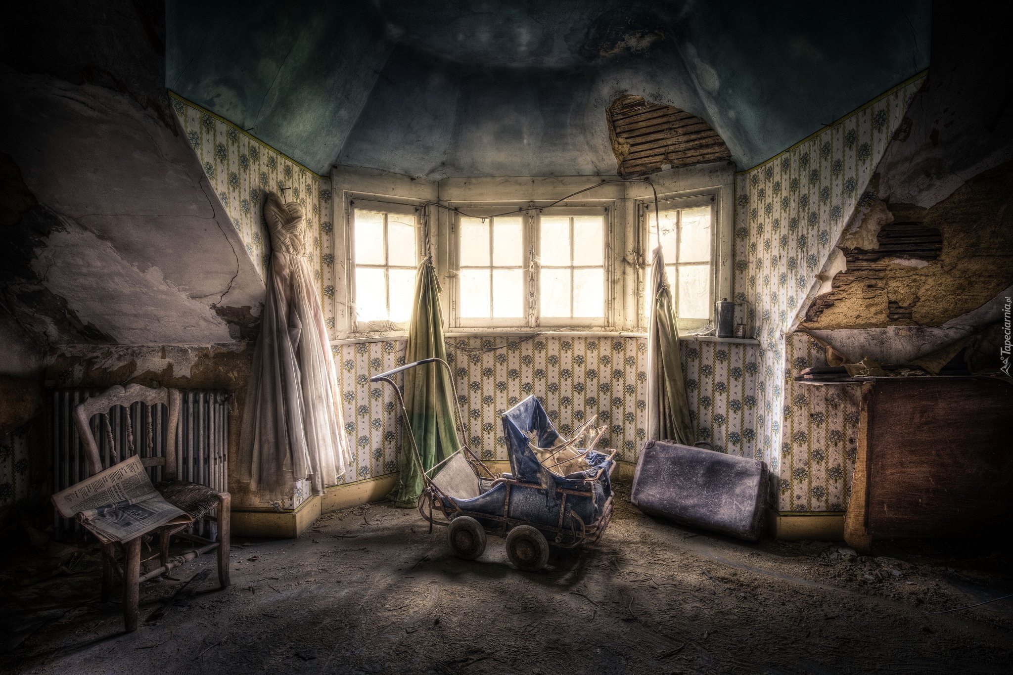 Edytor tapety: Zrujnowane wnętrze z wózkiem i walizką
