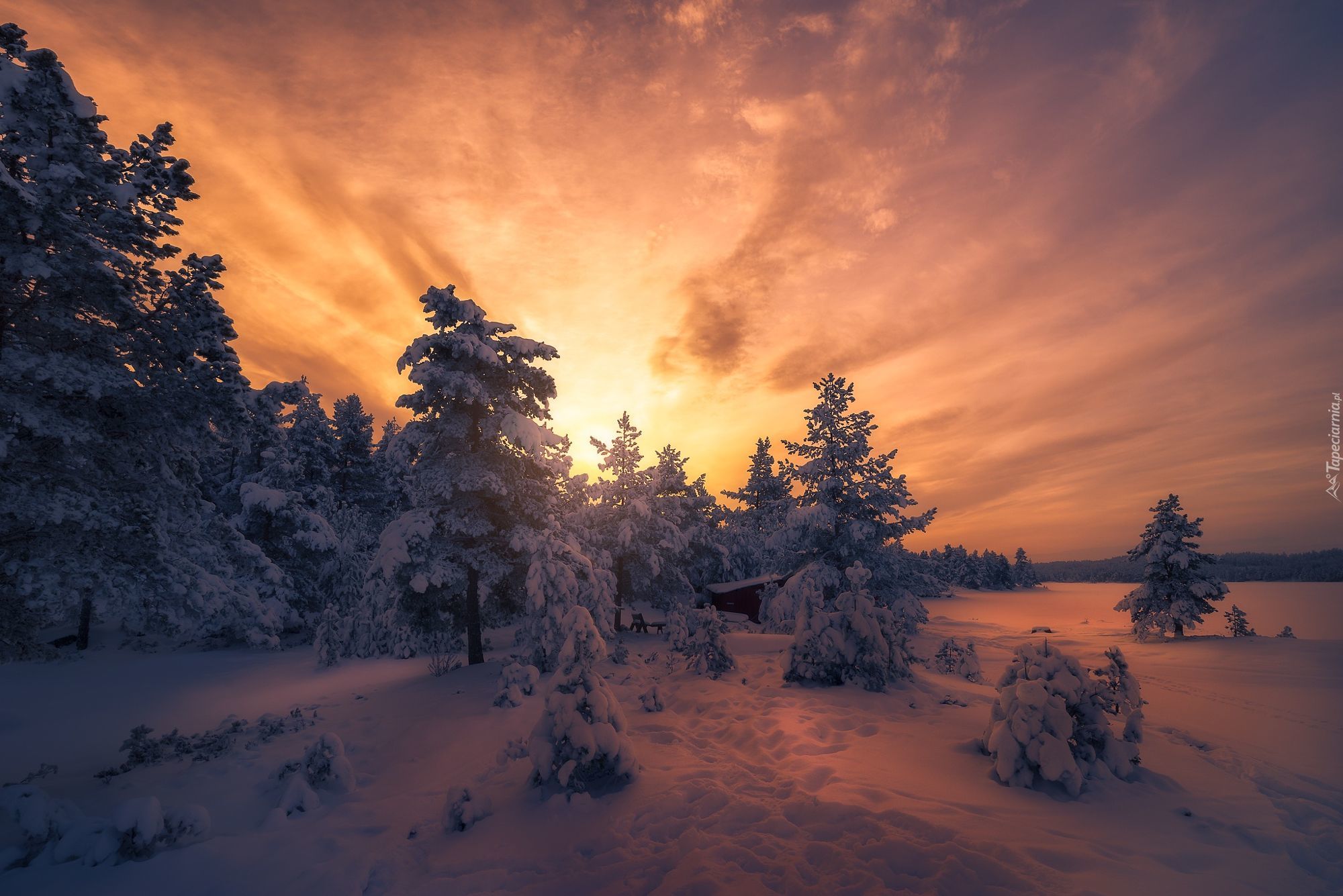 Edytor tapety: Zachodzące słońce nad zimowym lasem