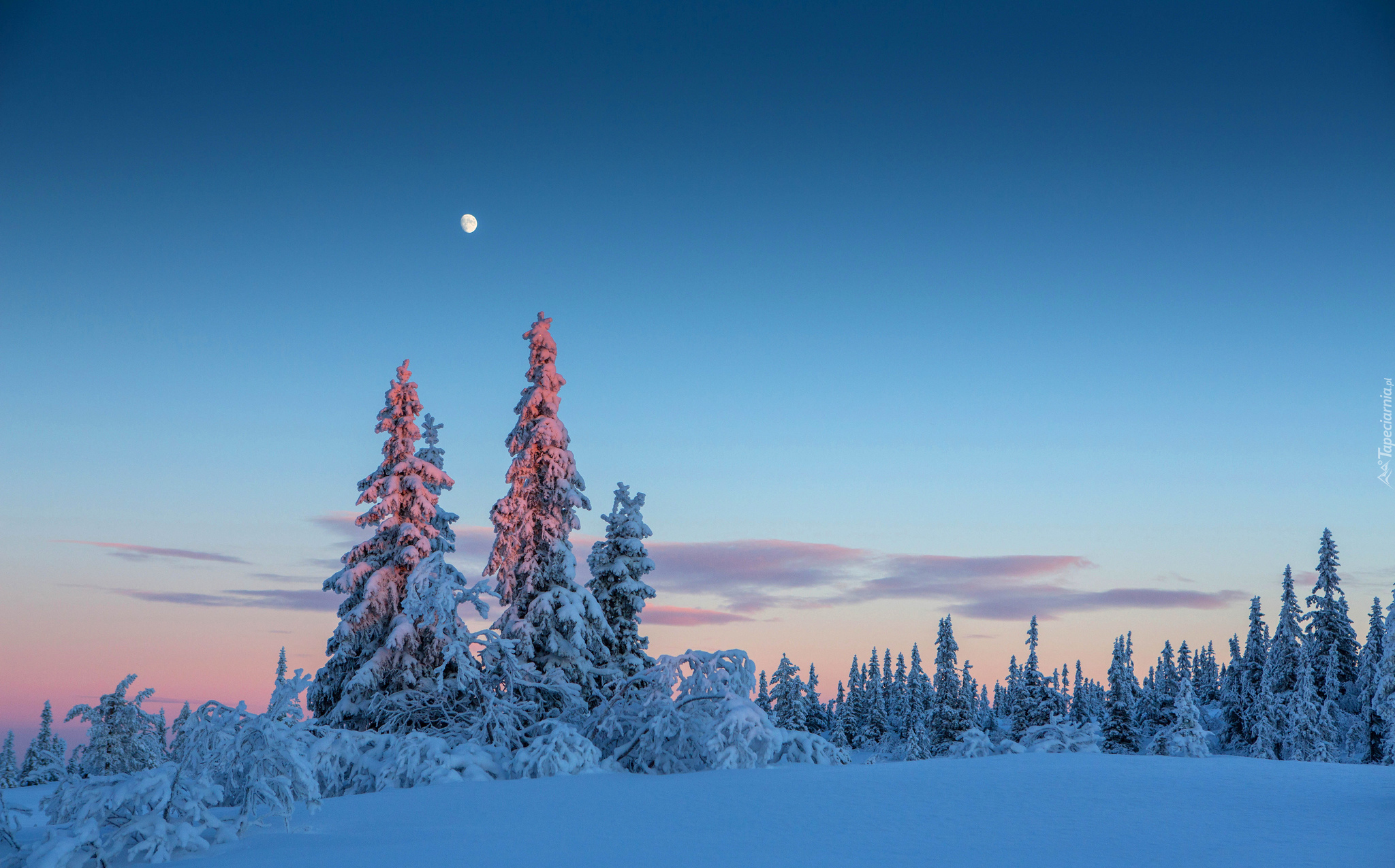 Edytor tapety: Ośnieżony las na stoku w świetle zachodzącego słońca