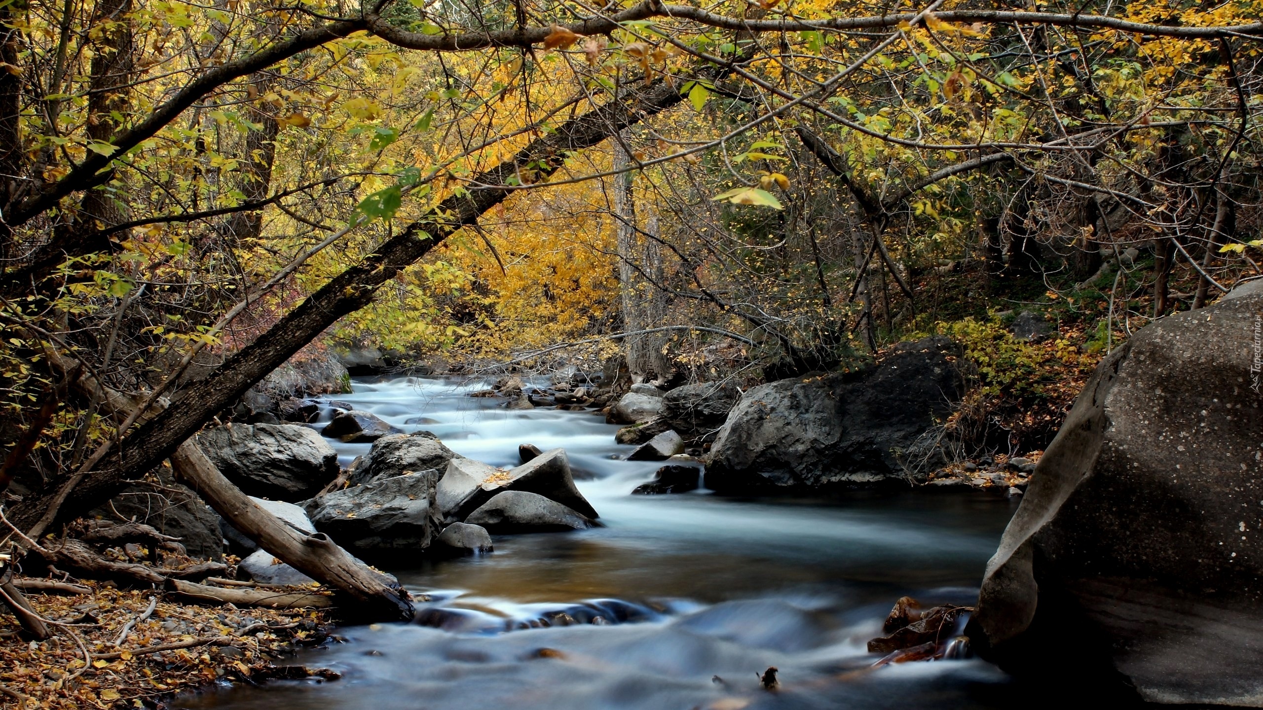 Edytor tapety: Rzeka wśród leśnych drzew i kamieni