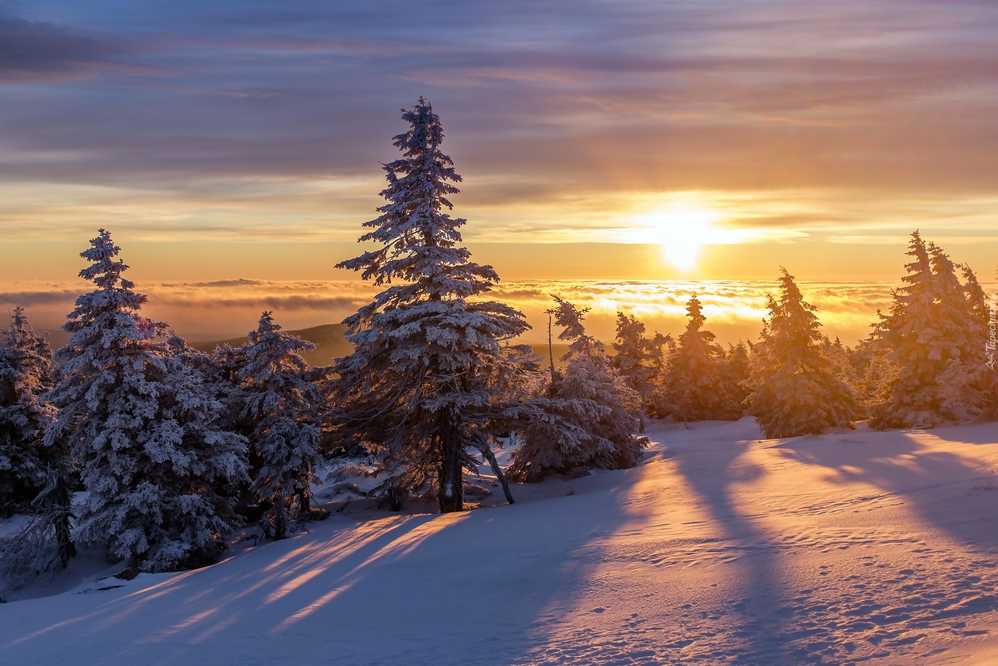 Edytor tapety: Słońce zachodzi za zimowy las